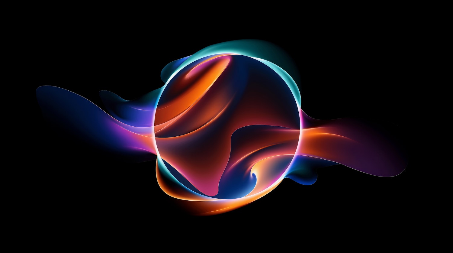 Abstract digital art with a glowing sphere and colorful light ribbons on a black background, creating a dynamic and futuristic vibe.
