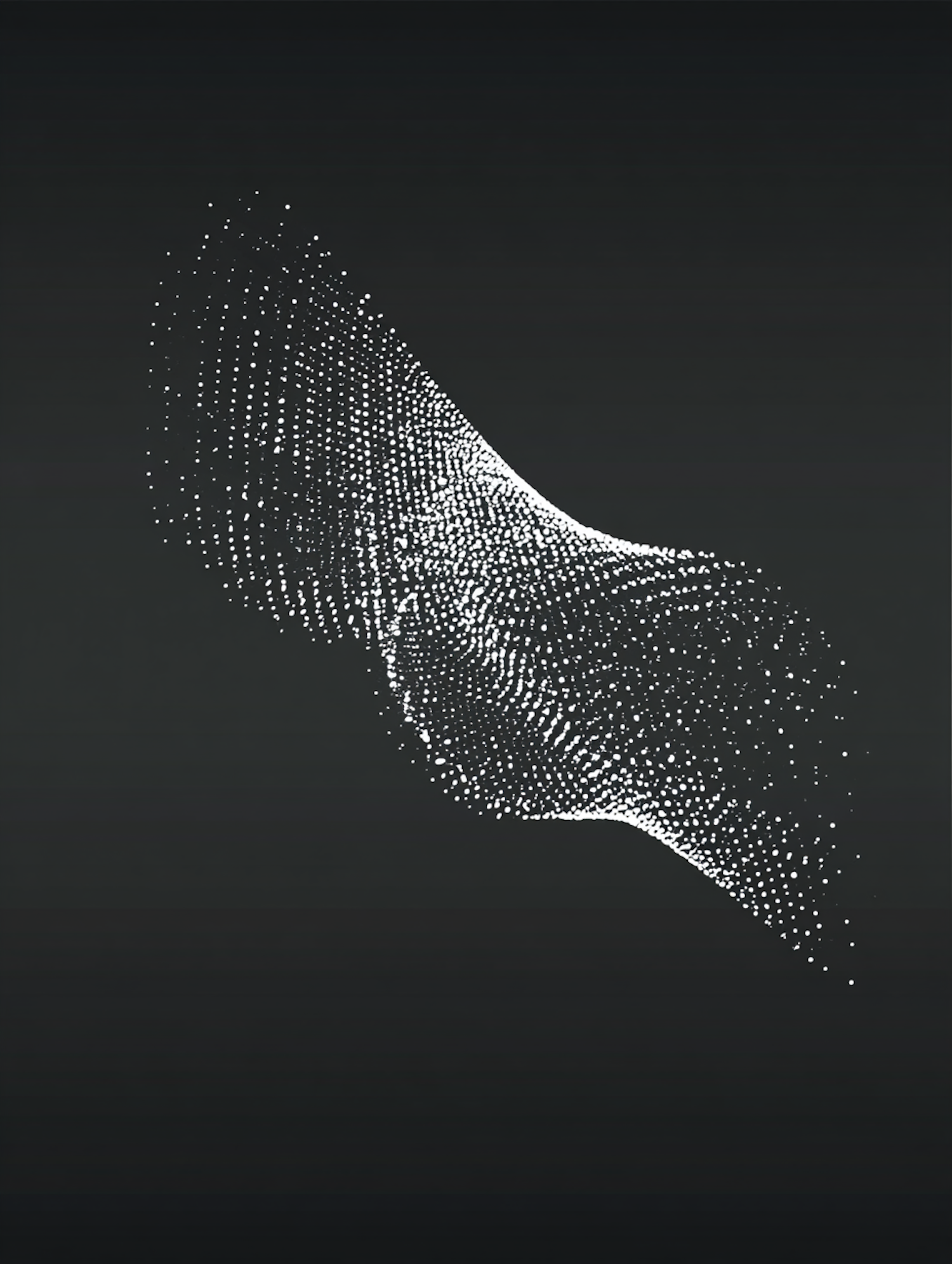 Abstract digital art of white dots forming a flowing wave-like structure on a dark background, creating a sense of motion and depth.