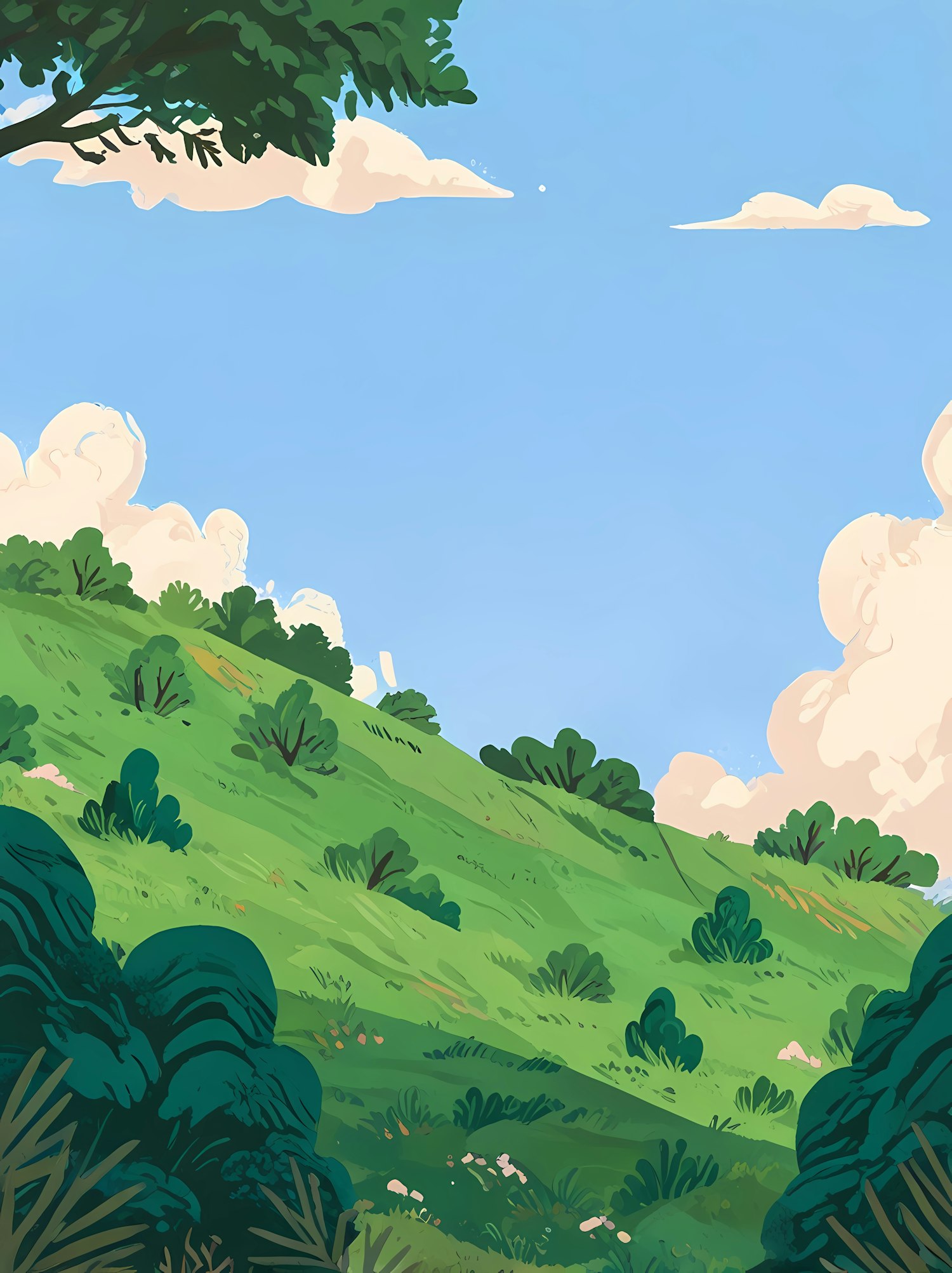 Bright and colorful illustration of a green hillside with bushes under a clear blue sky and fluffy clouds.