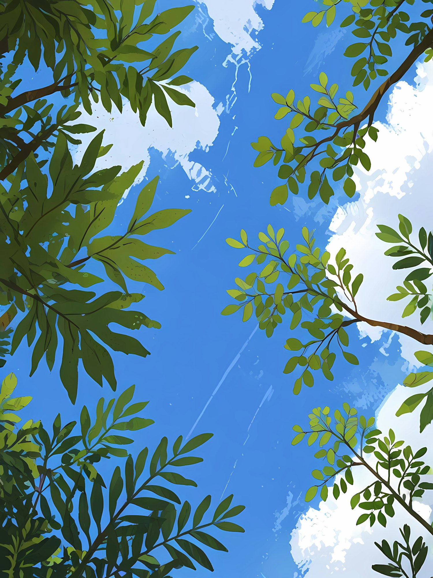 Illustration of a clear blue sky framed by lush green tree branches and fluffy white clouds, creating a serene natural scene.