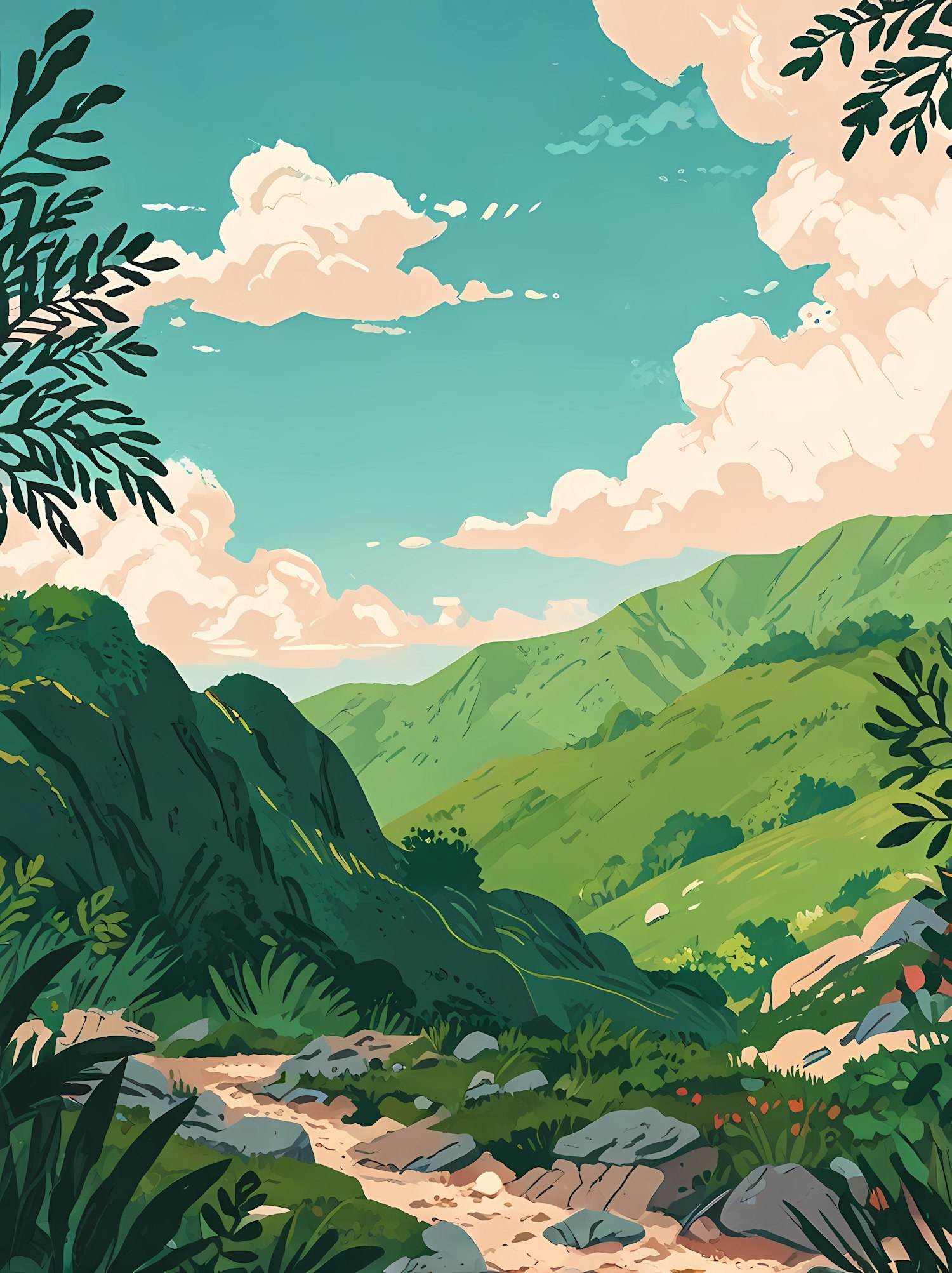 A colorful illustration of a lush valley with green hills, a rocky path, and a bright blue sky with fluffy clouds. Perfect for nature lovers.