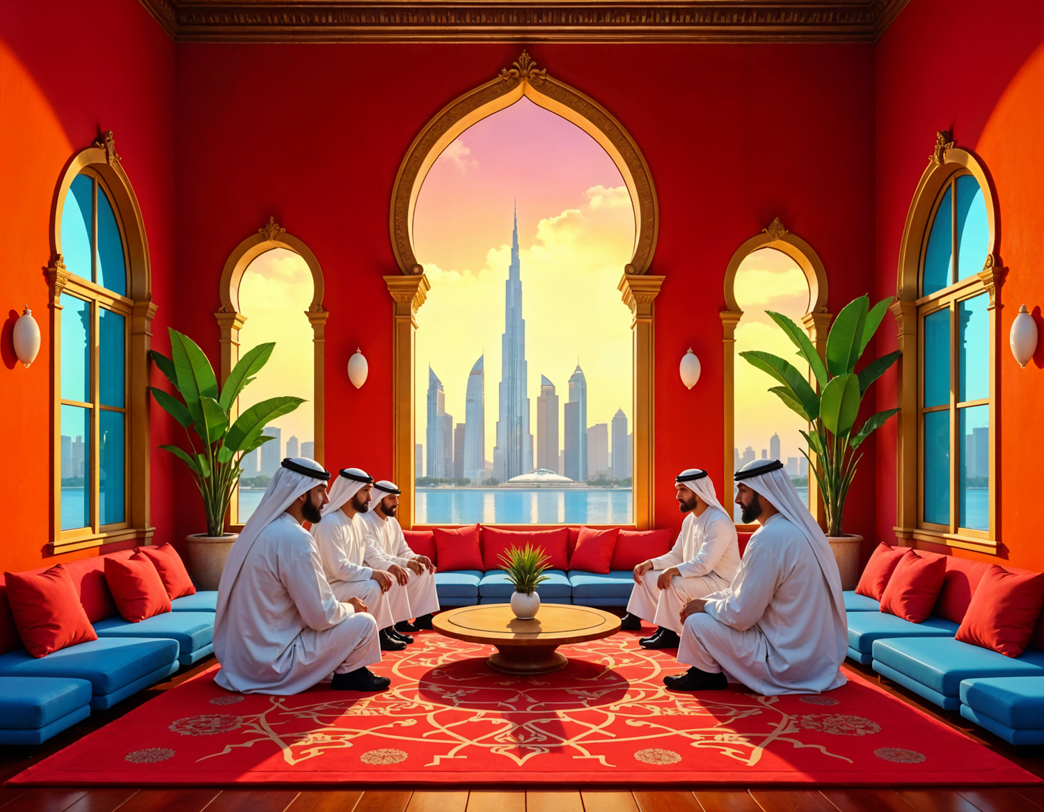 Elegant gathering of men in traditional Emirati attire in a luxurious room with a stunning view of Dubai's skyline at sunset.