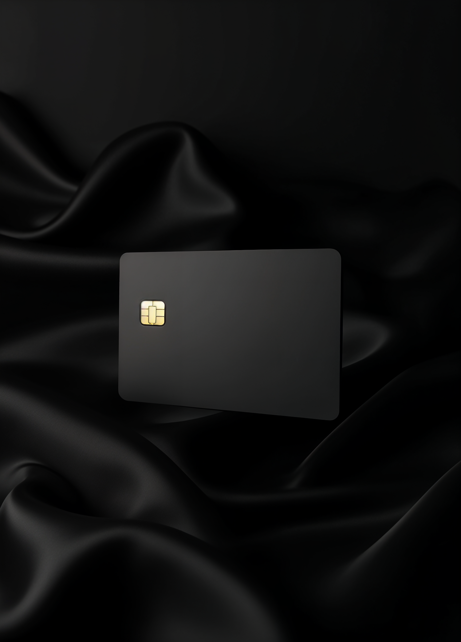 Minimalist black credit card with a golden chip on a luxurious black satin fabric background, showcasing elegance and premium design.