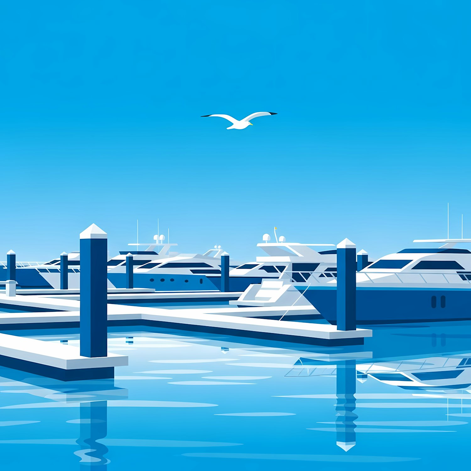 Stylized marina scene with luxury yachts, calm blue waters, and a seagull flying above, evoking a serene and upscale coastal vibe.