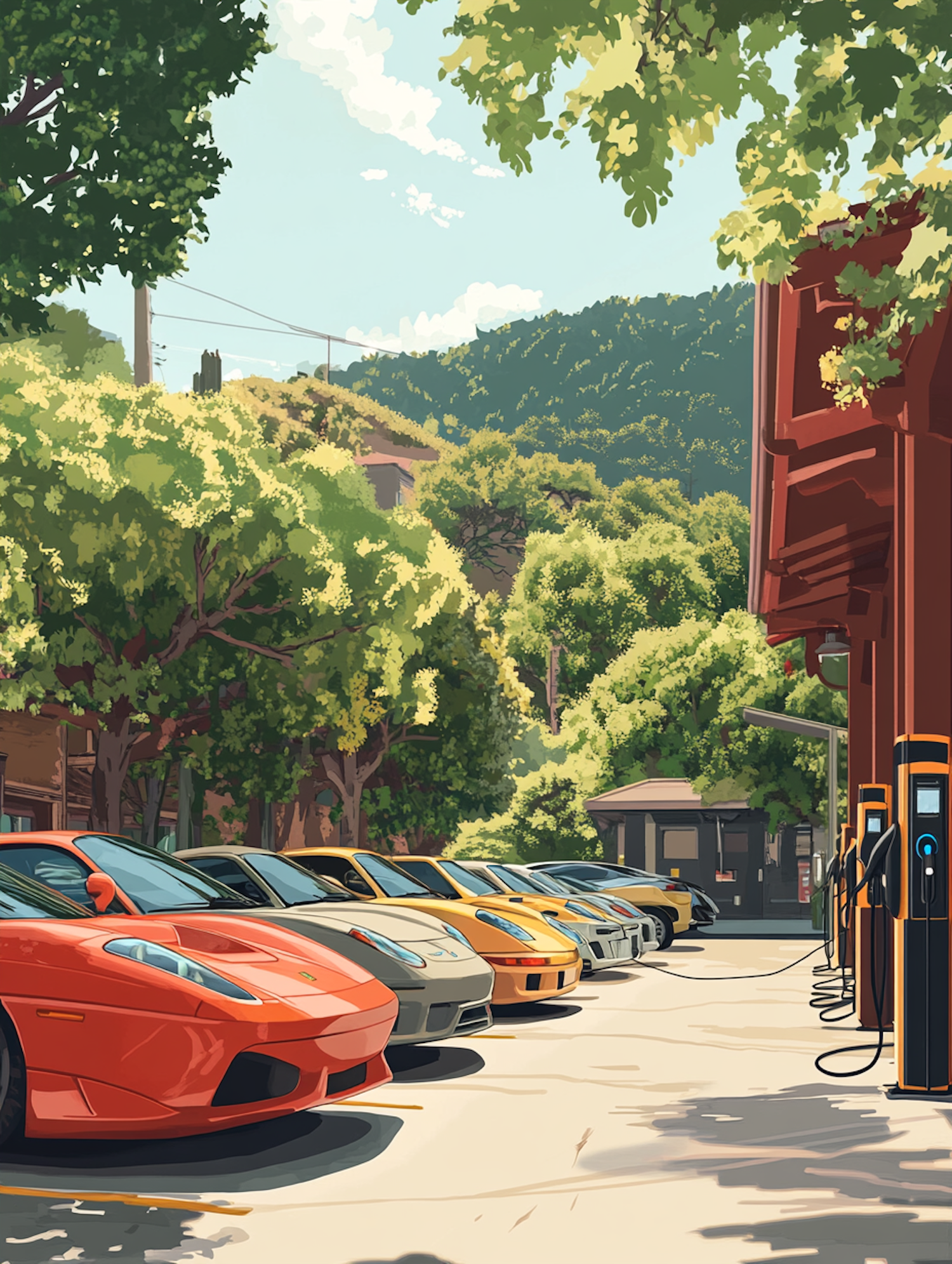 Illustration of luxury sports cars parked near EV chargers, surrounded by lush greenery and hills under a sunny sky.