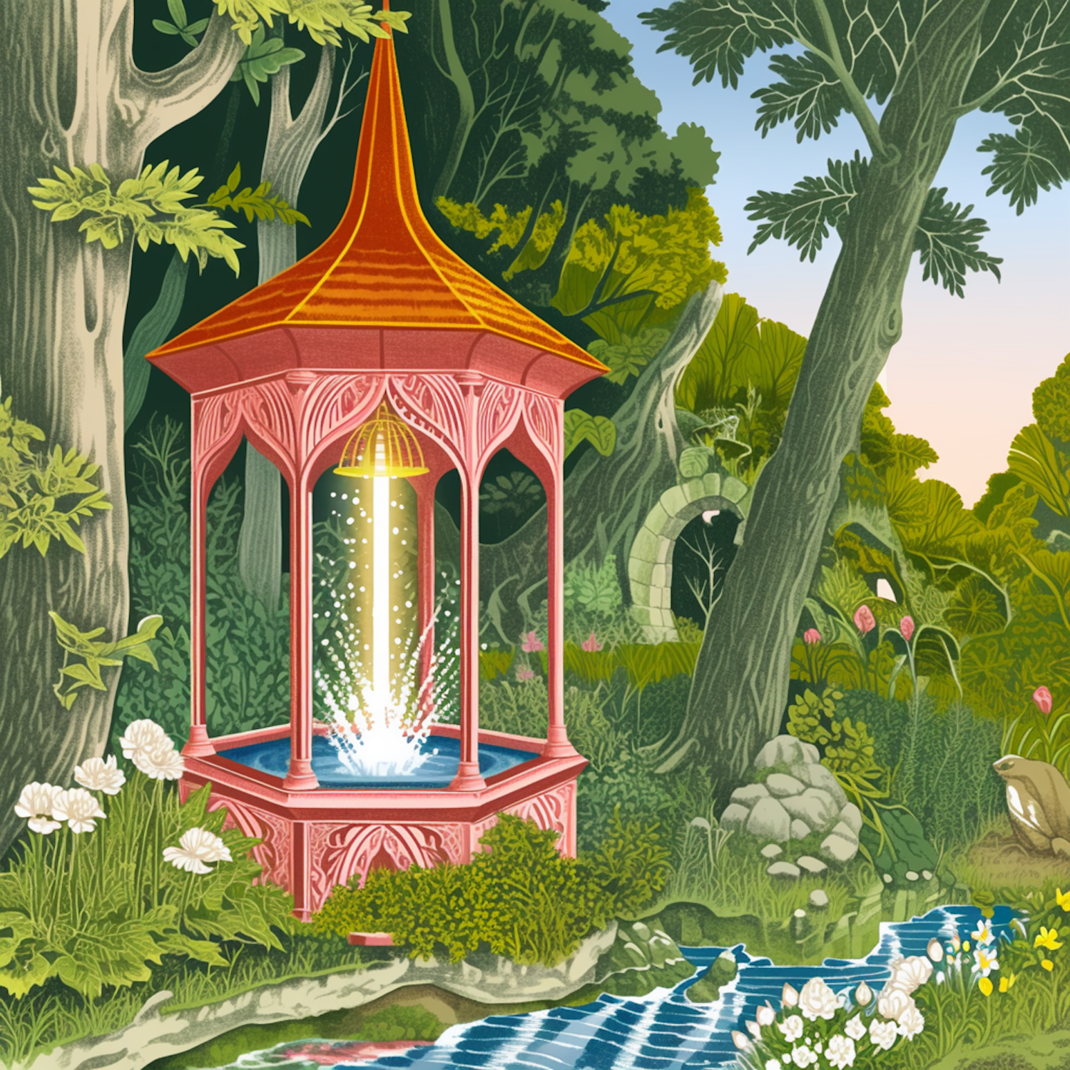 Enchanting forest illustration with a glowing gazebo, lush greenery, vibrant flowers, and a serene stream flowing through the scene.