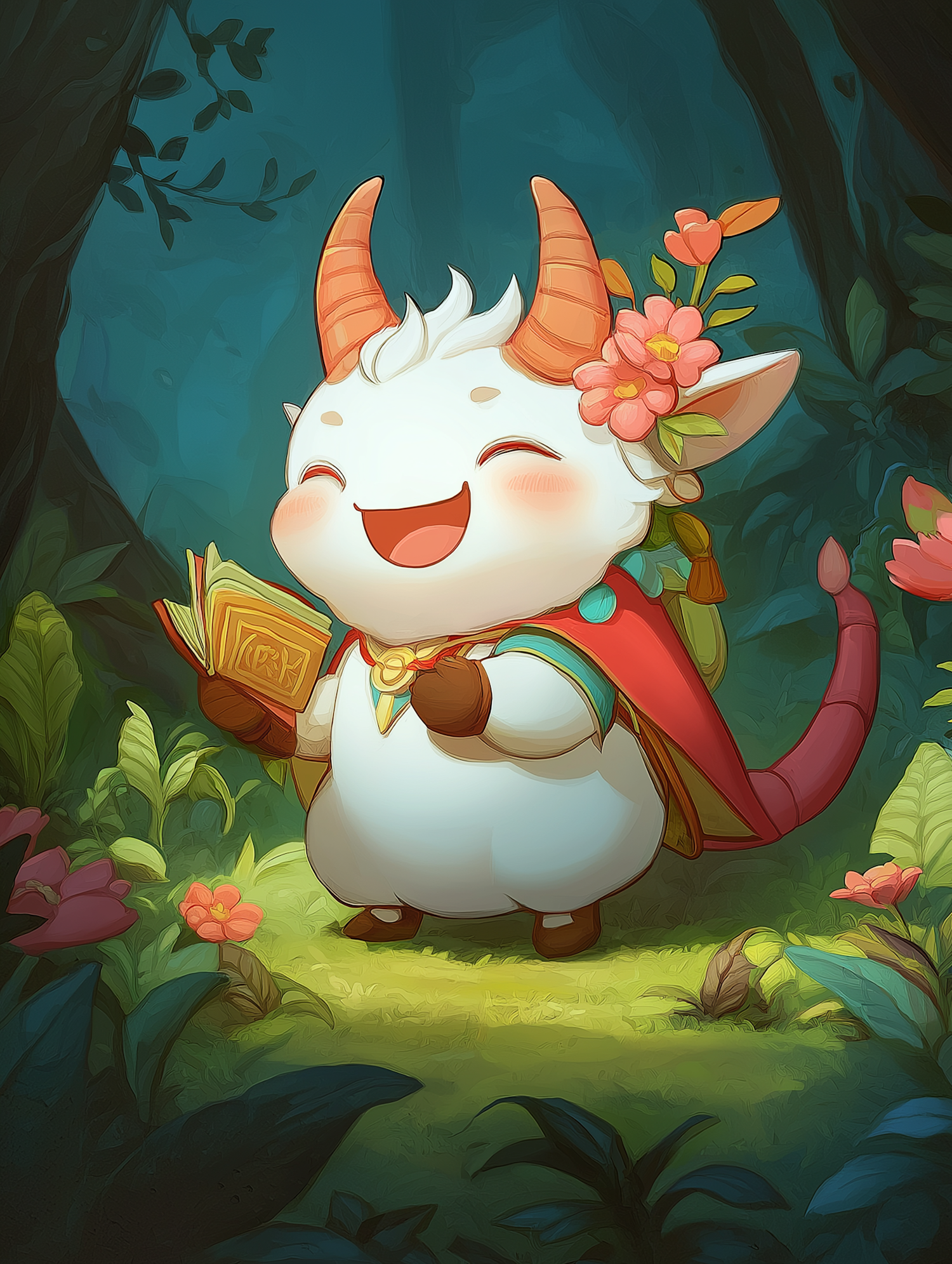 Adorable goat-like creature in a magical forest, holding a glowing book, wearing a red cape and flowers, surrounded by lush greenery.