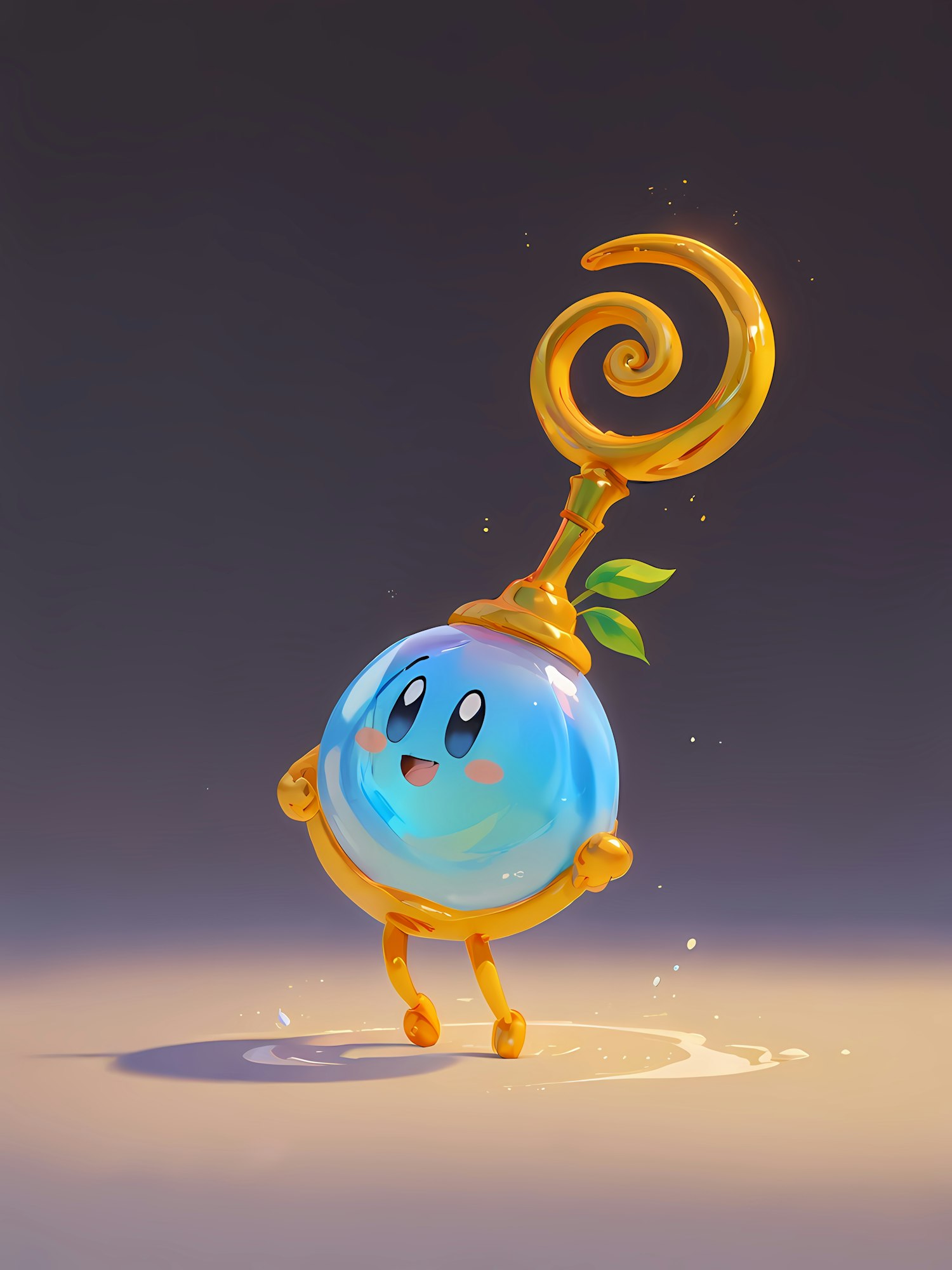 A cute magical potion bottle character with a glowing golden stopper, blue body, and cheerful face in a whimsical illustration.