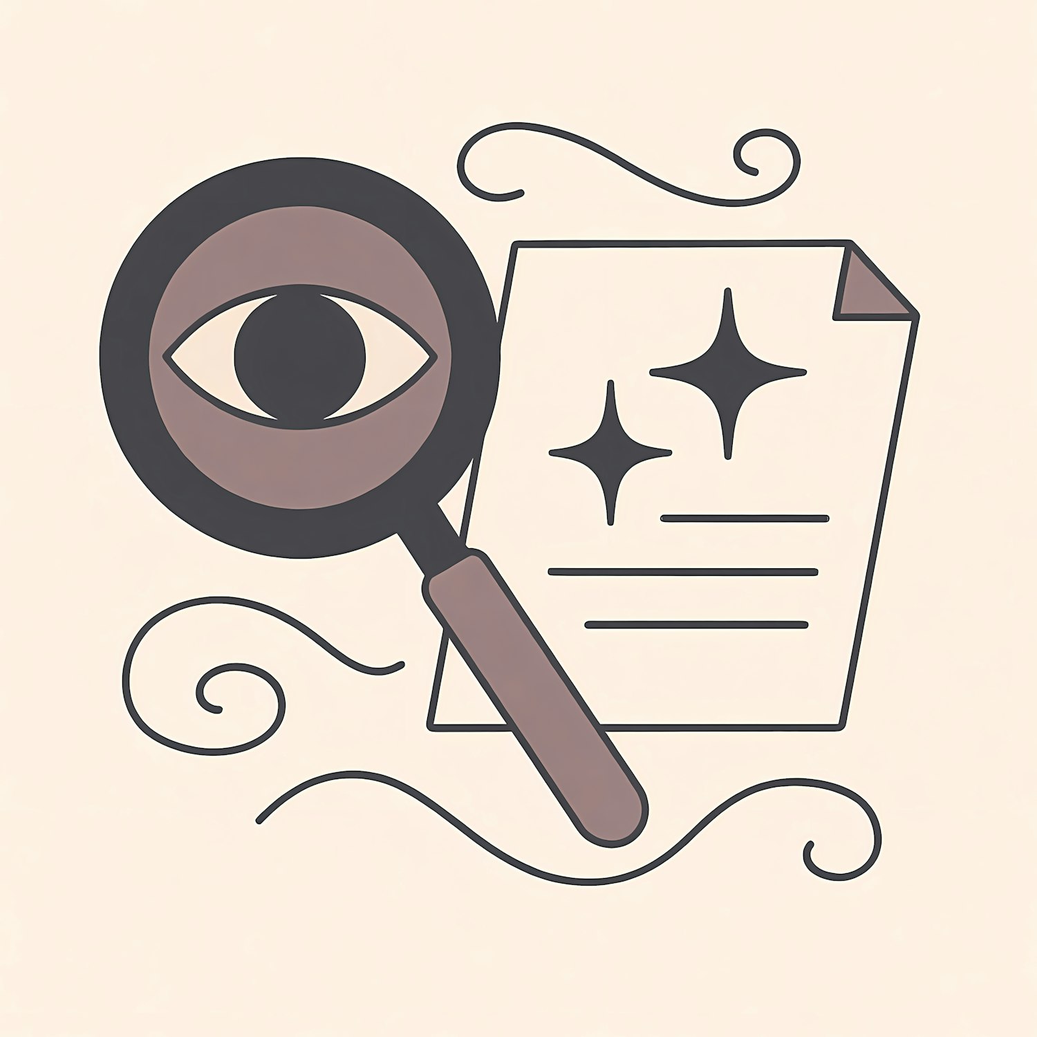 Minimalist illustration of a magnifying glass with an eye, a document with stars, and swirling lines on a beige background.