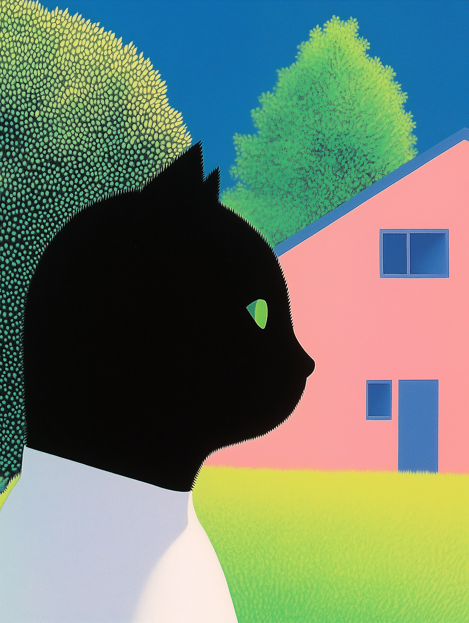 Stylized illustration of a black cat with green eyes, a pink house, and lush trees under a bright blue sky.