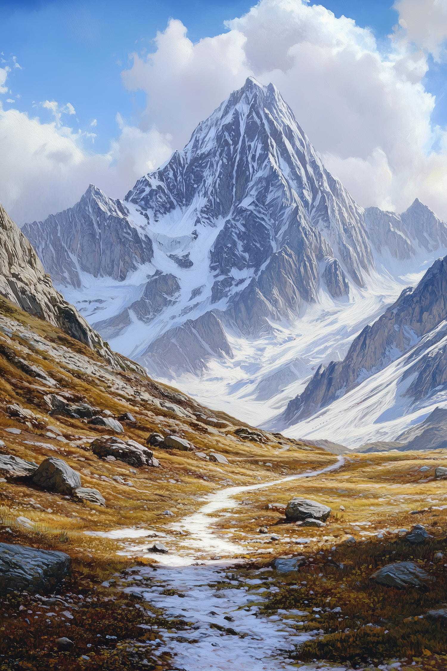 Majestic snow-capped mountain with a winding path, golden grass, and blue sky with clouds. Serene and awe-inspiring landscape.