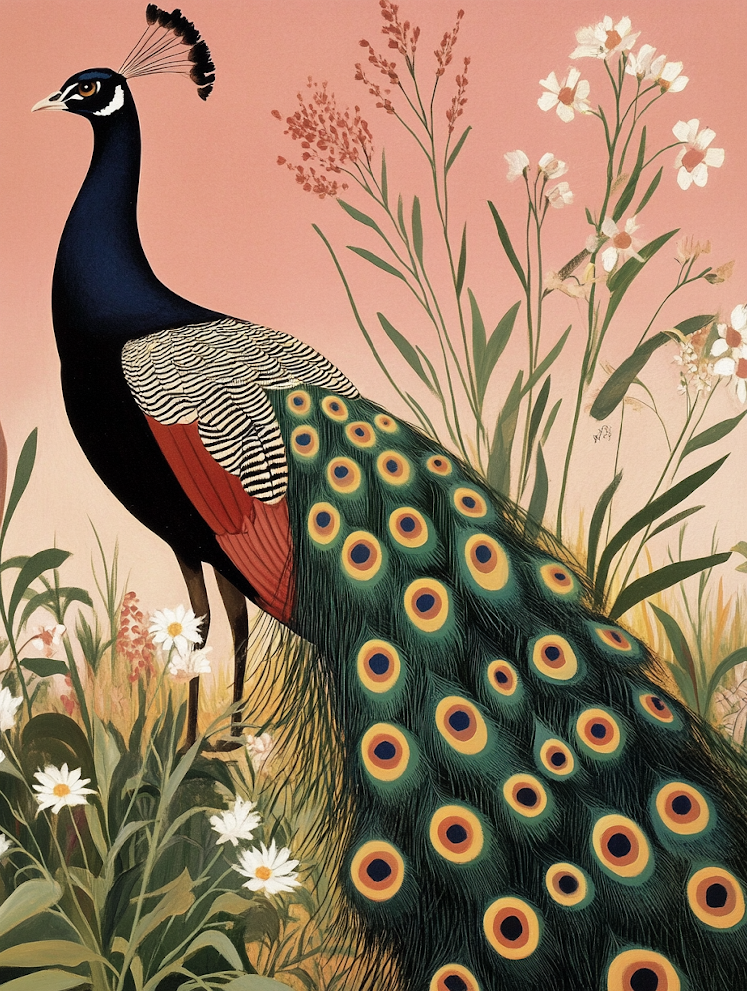 Elegant peacock illustration with vibrant plumage and floral background, showcasing nature's beauty and tranquility.