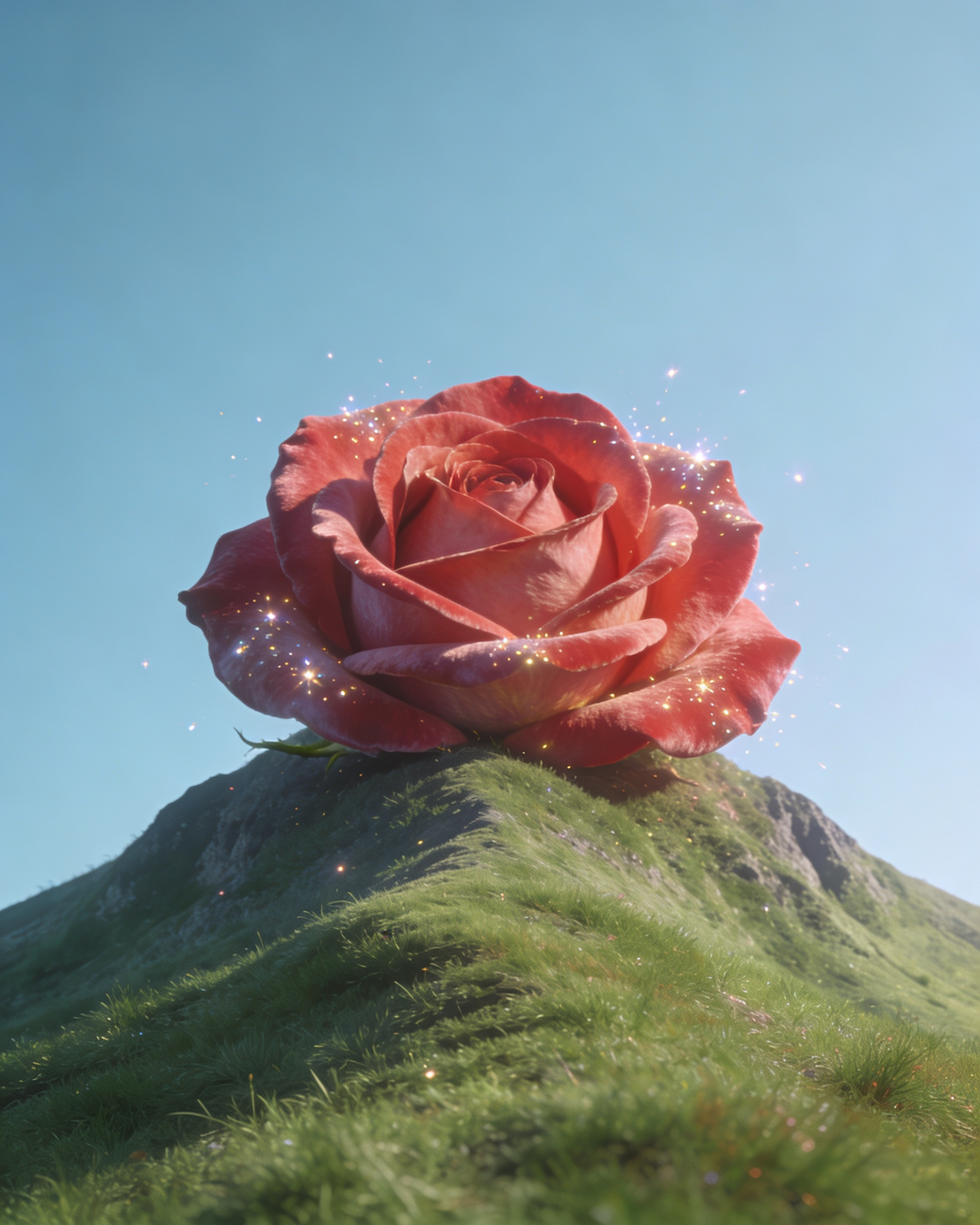 A stunning red rose atop a green hill under a clear blue sky, surrounded by sparkling particles, creating a magical scene.