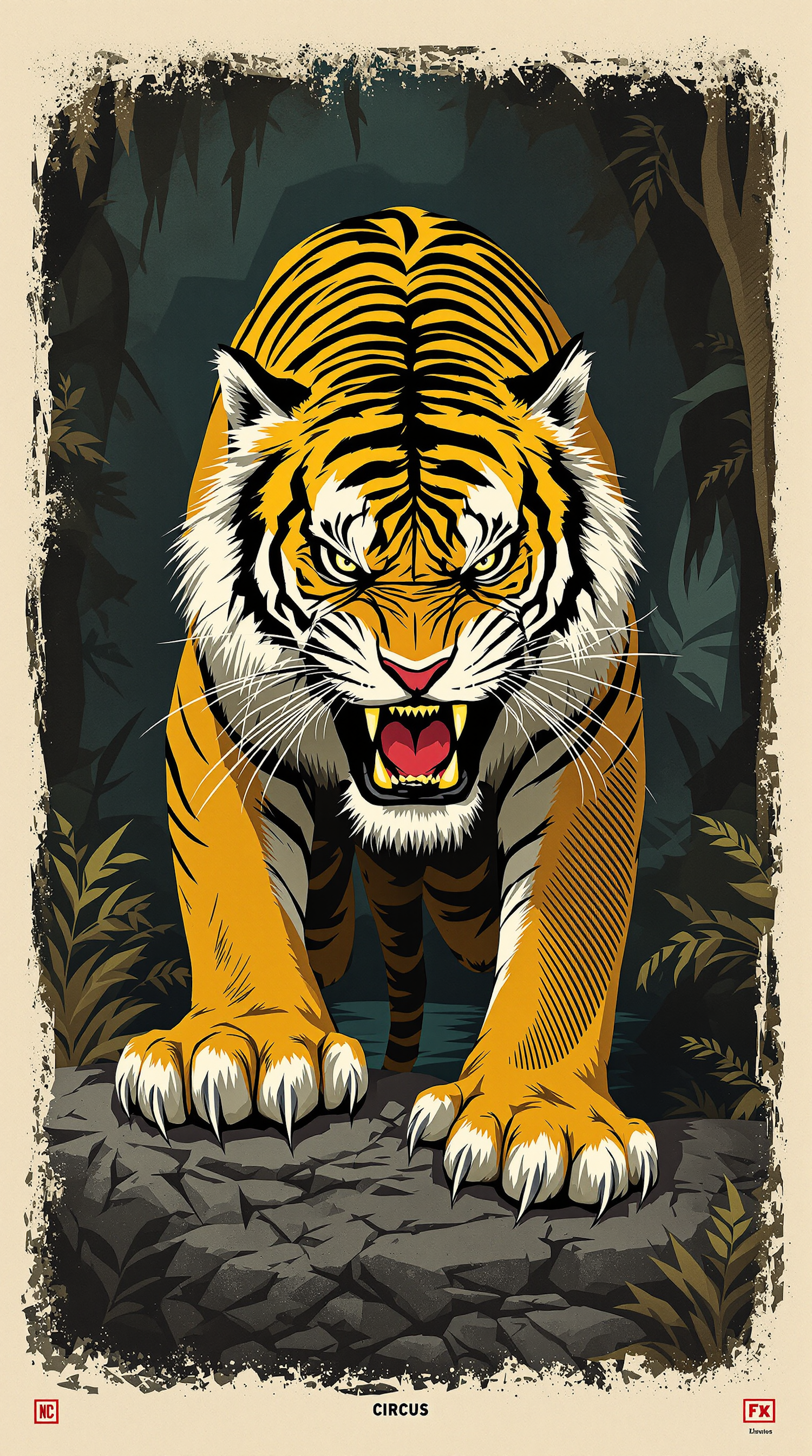 Bold illustration of a roaring tiger in a jungle setting, showcasing its fierce expression and vibrant orange and black stripes.