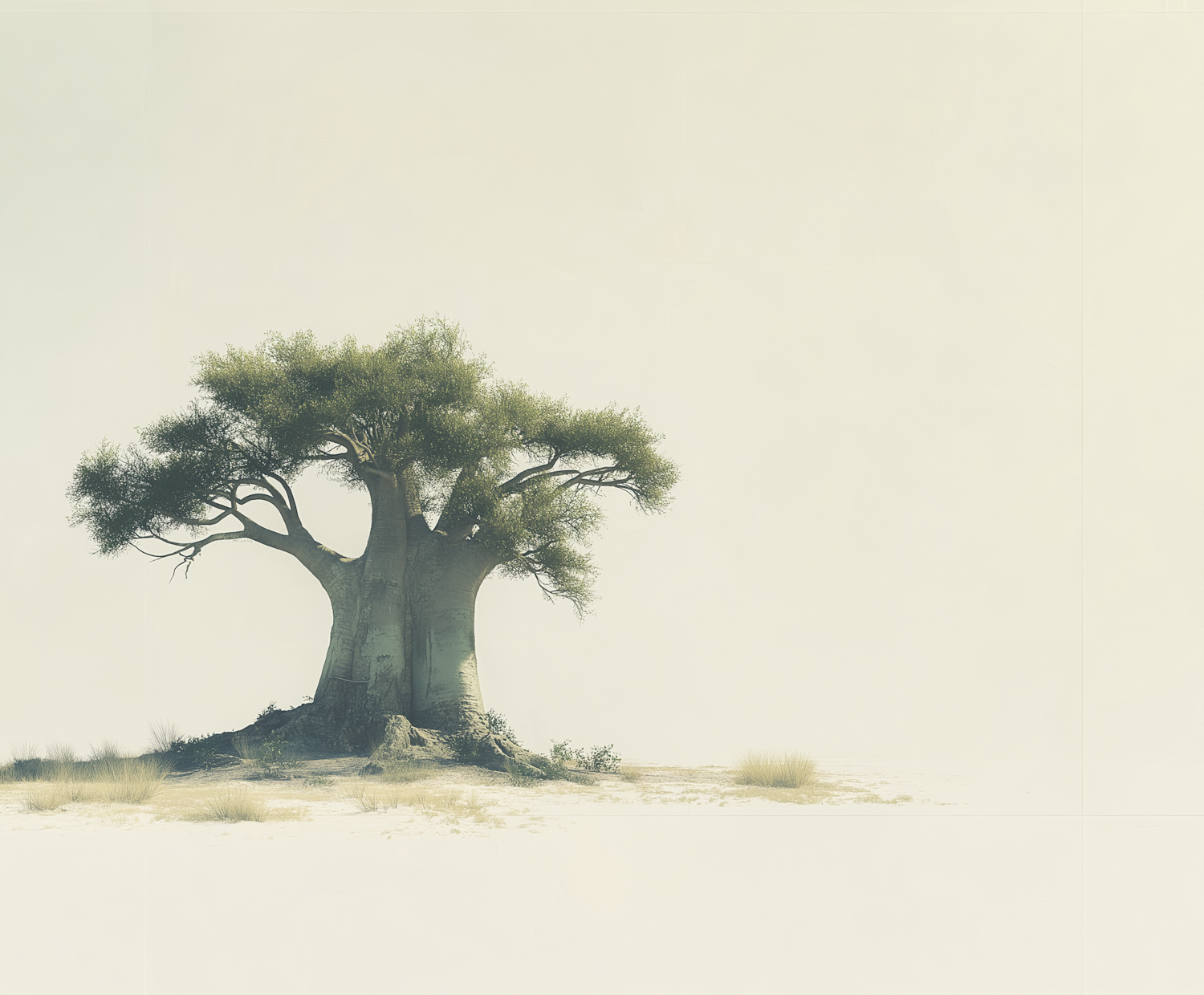 Majestic baobab tree in a serene, open landscape with a pale sky and sparse grass, highlighting its grandeur and resilience.