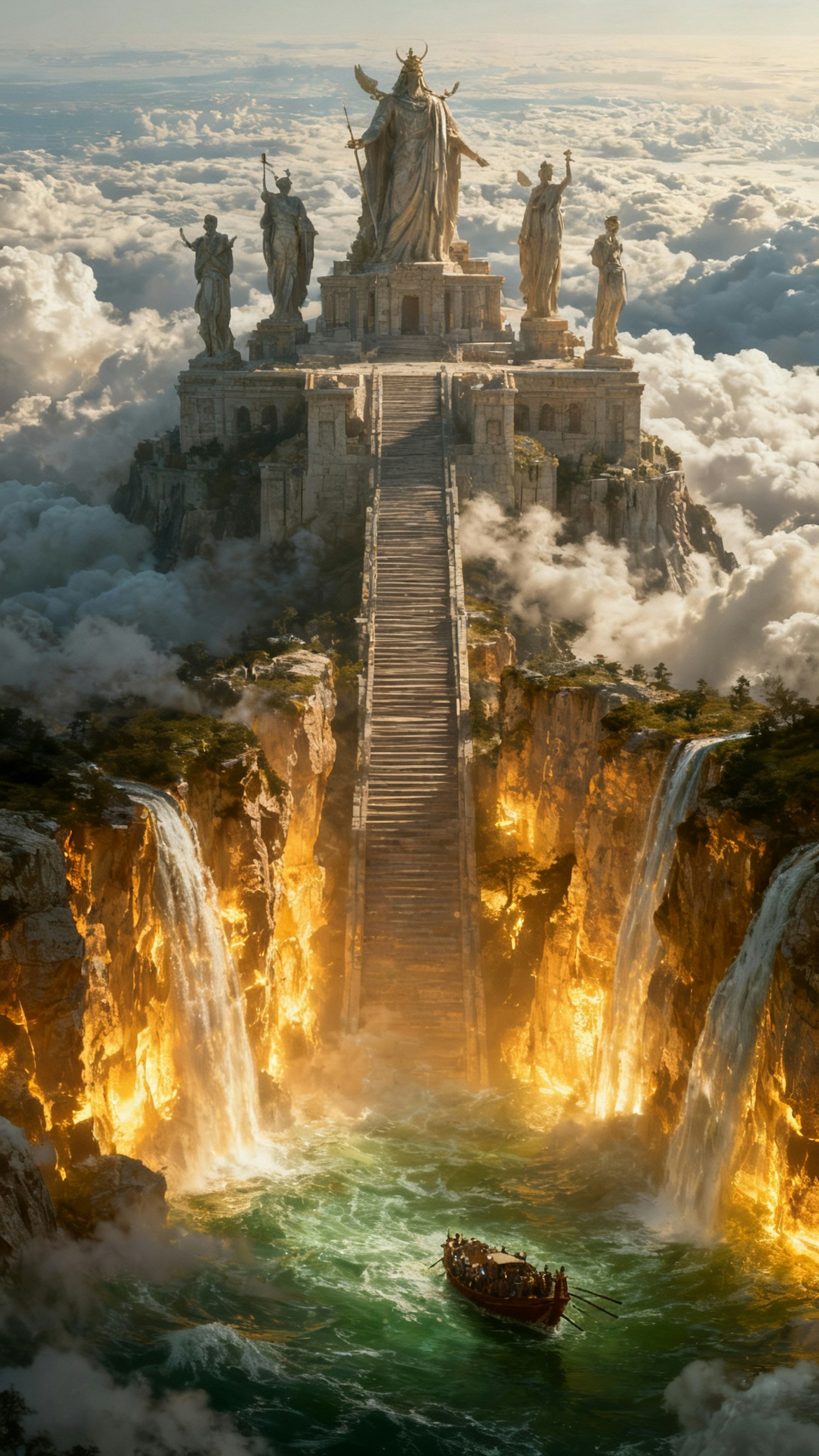 A breathtaking scene of a temple atop a mountain with glowing waterfalls and a boat on a green river, evoking a mythical atmosphere.