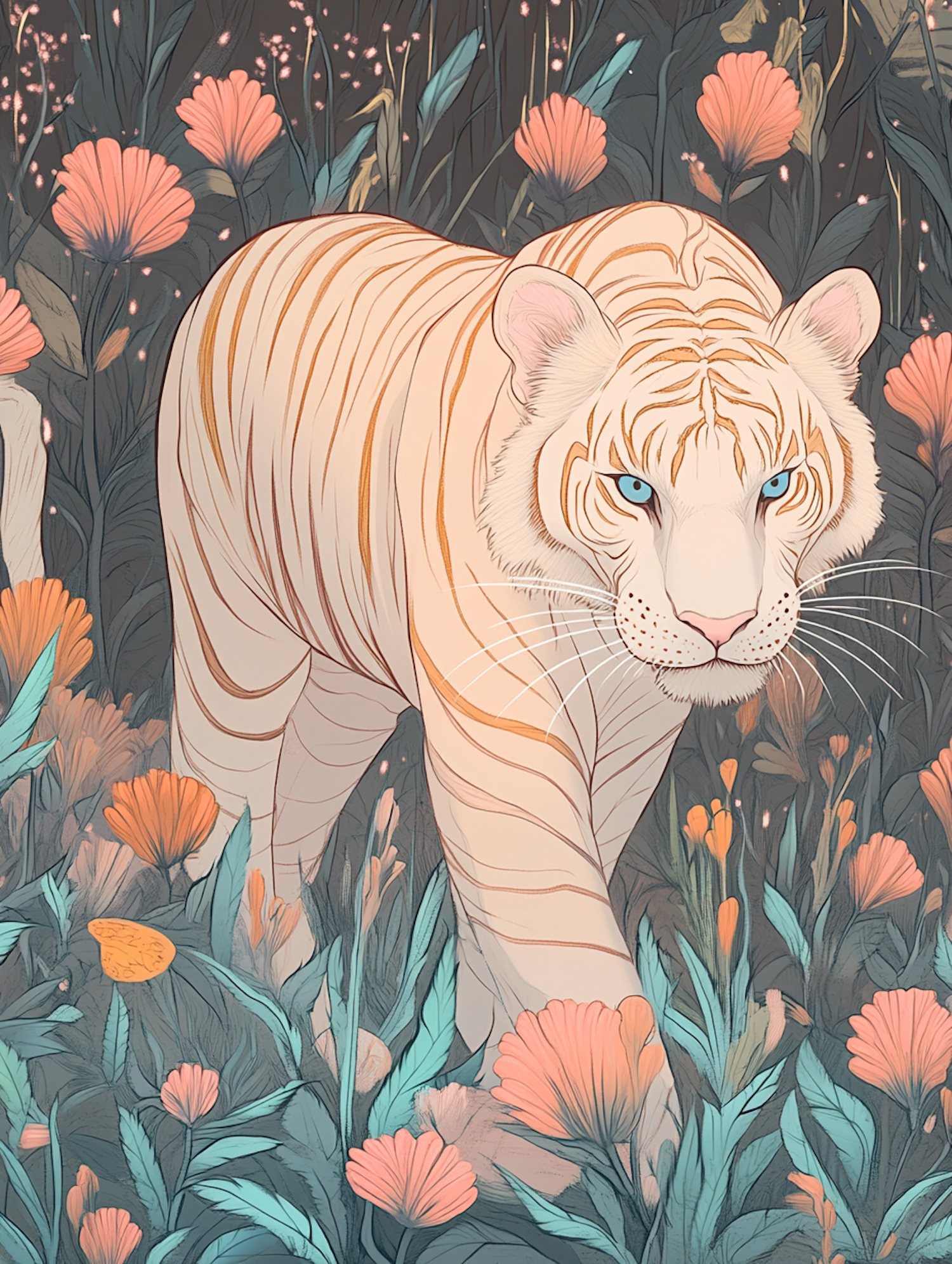Majestic white tiger with blue eyes prowling through a vibrant jungle of pink and orange flowers. Enchanting and dreamlike illustration.