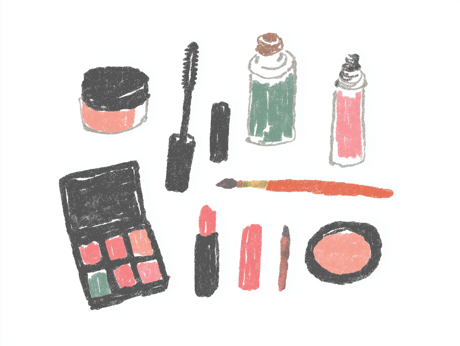 Charming crayon-style illustration of makeup essentials, including lipstick, mascara, blush, and a palette, in soft pastel tones.