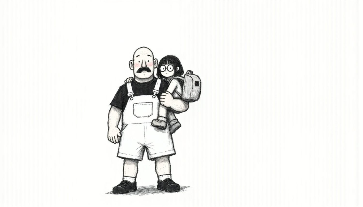 Illustration of a man in overalls holding a child with glasses and a backpack, drawn in a minimalist black-and-white style.