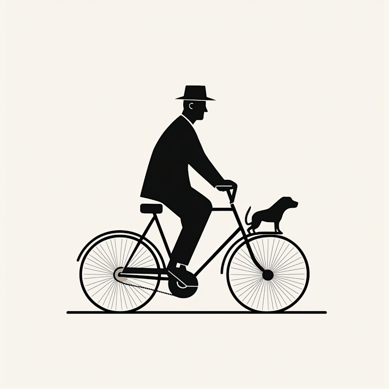 Minimalist black-and-white illustration of a man cycling with a small dog on the front fender, exuding vintage charm and simplicity.