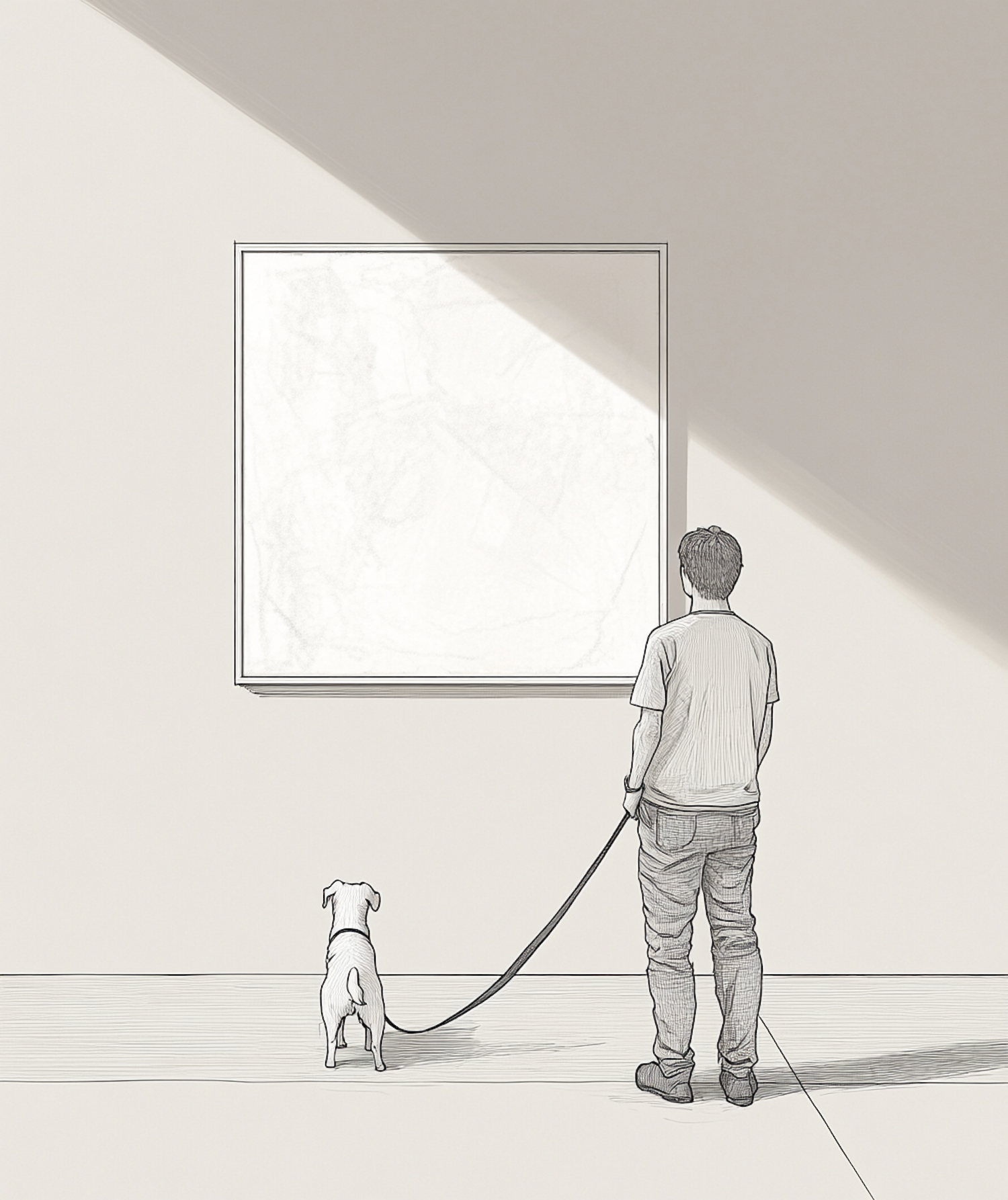 Monochrome illustration of a man and dog gazing at an empty frame, evoking contemplation and calmness in a minimalist setting.