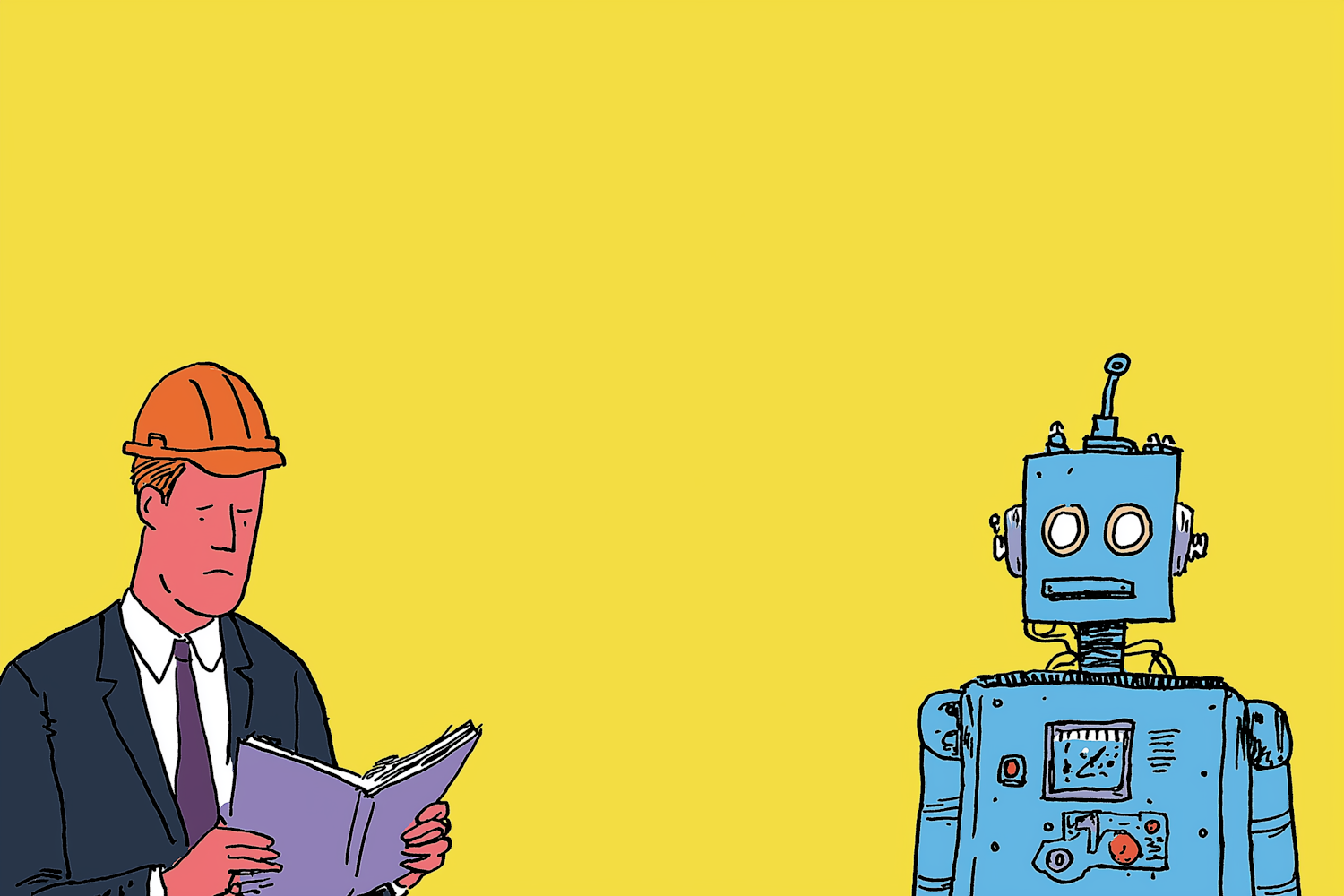 Cartoon of a man in a suit with a construction helmet reading a book, next to a blue robot, set against a bright yellow background.