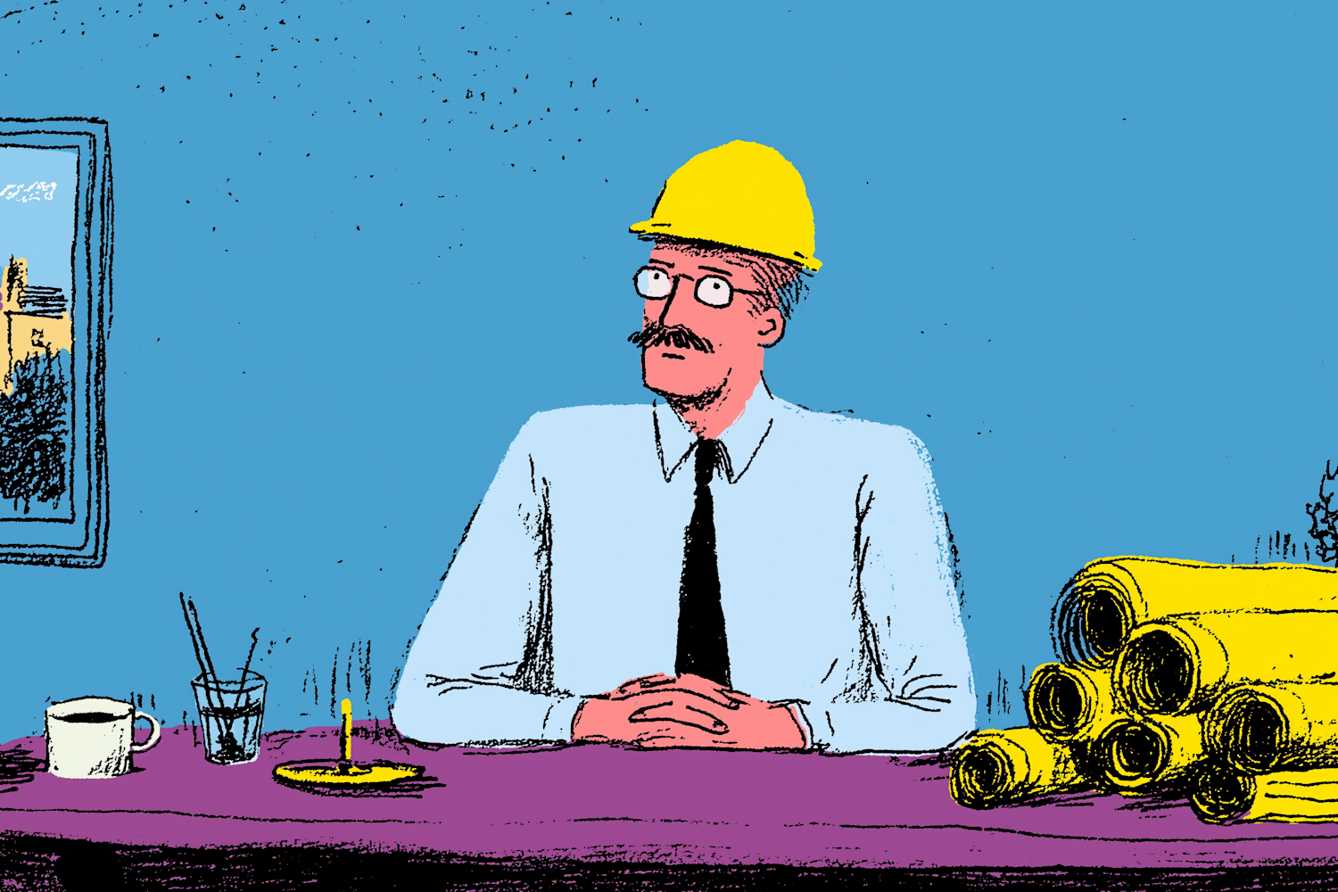 Illustration of a man in a hard hat at a desk with blueprints, a cup, and a candle, set against a blue background.