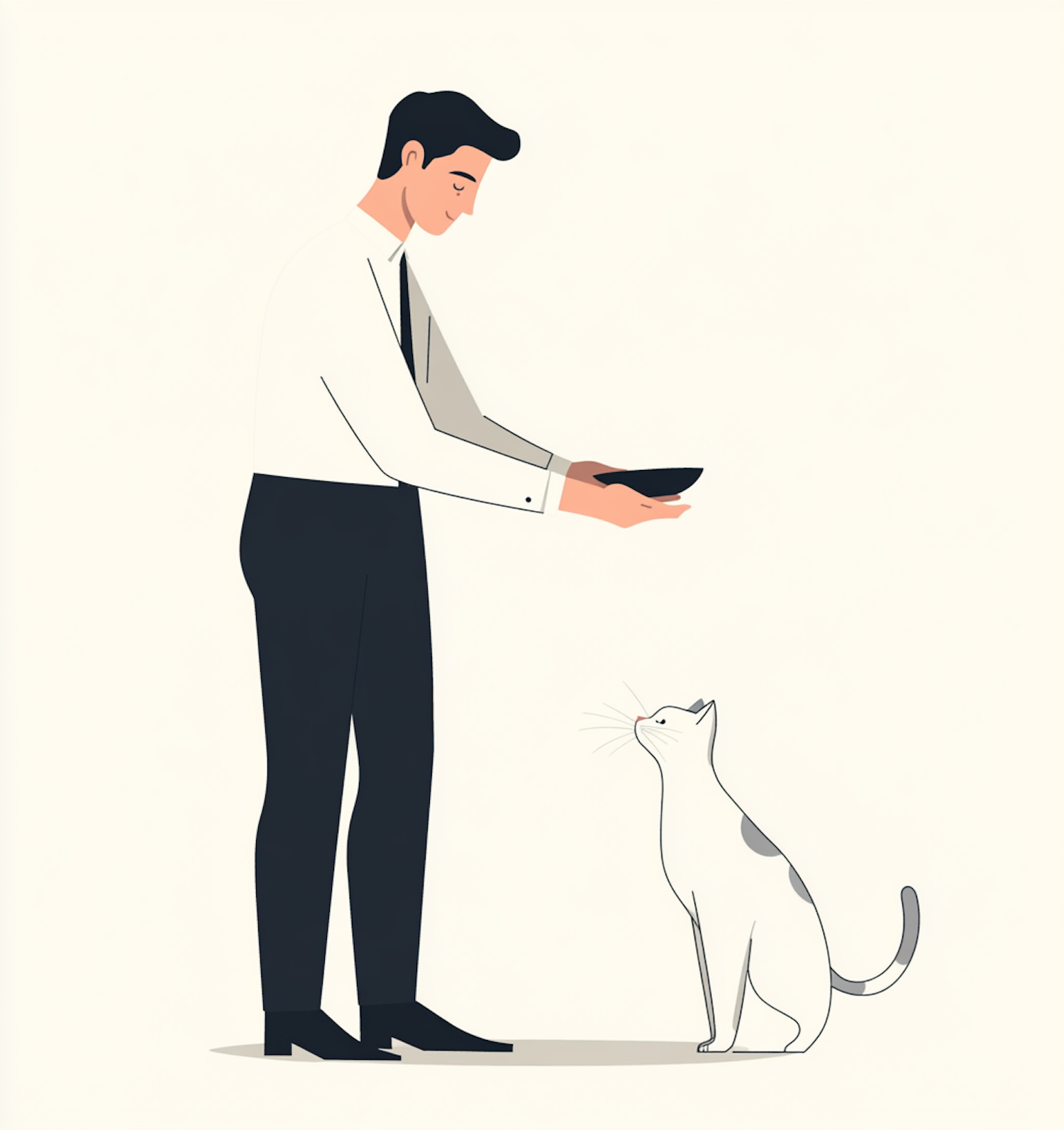 Minimalist illustration of a man offering a bowl to a curious cat, highlighting a simple and gentle interaction.