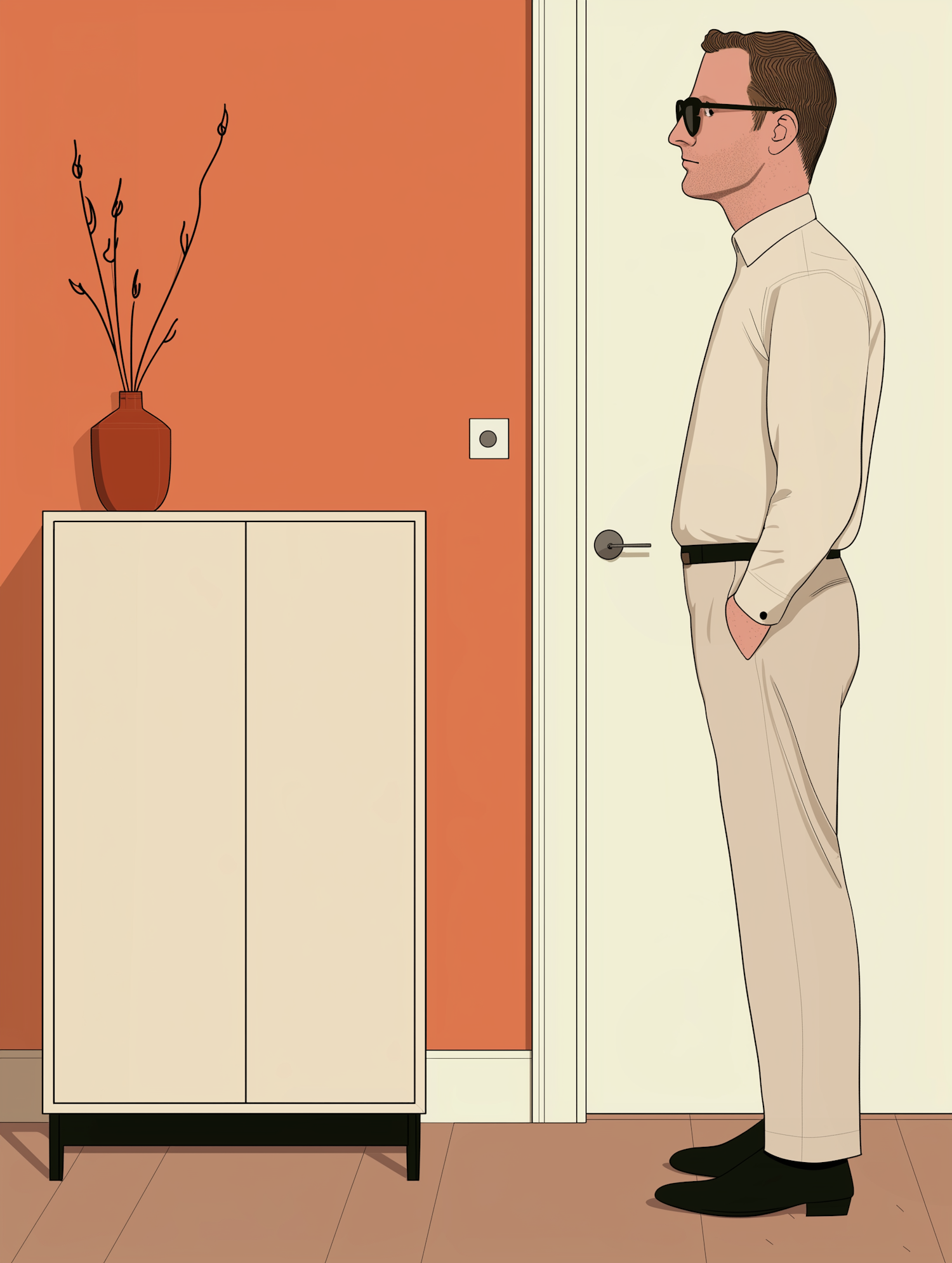 Stylish man in beige attire stands against an orange wall, exuding calm. Minimalist decor with a vase adds artistic flair.