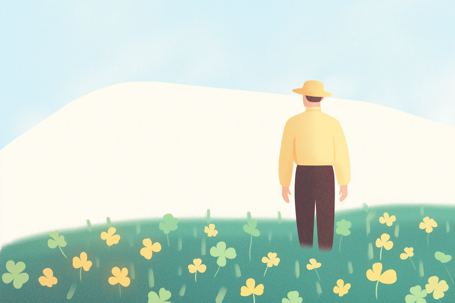 Minimalist illustration of a man in a yellow shirt and hat standing in a clover field under a pastel blue sky.