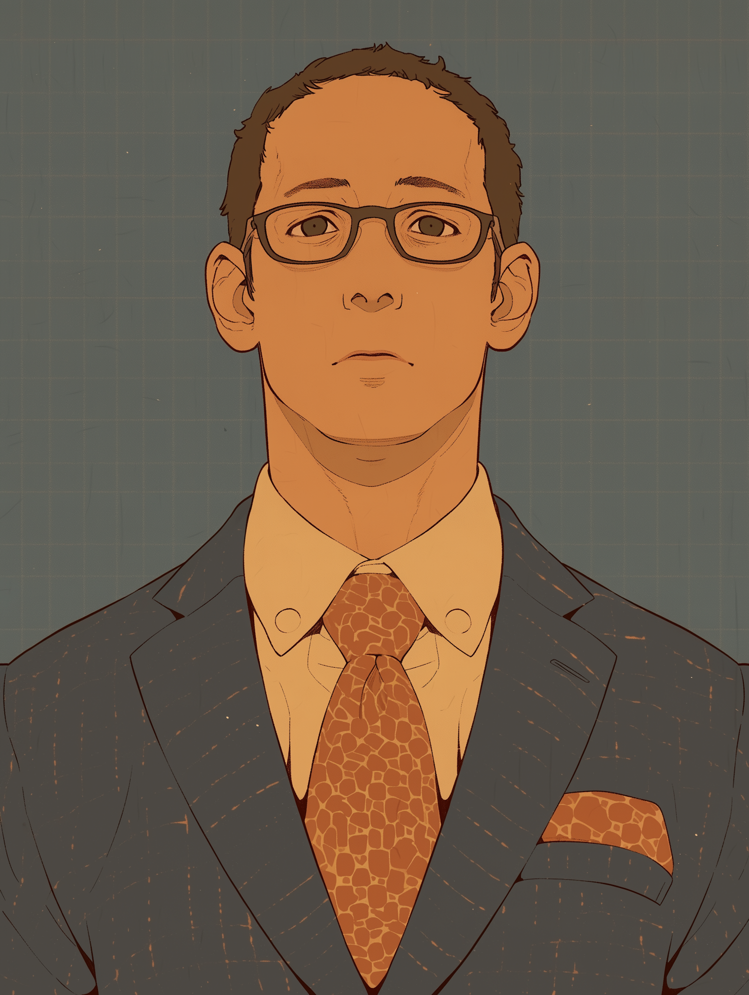 Stylized illustration of a man in a suit with glasses, featuring a giraffe-patterned tie and pocket square against a teal grid background.