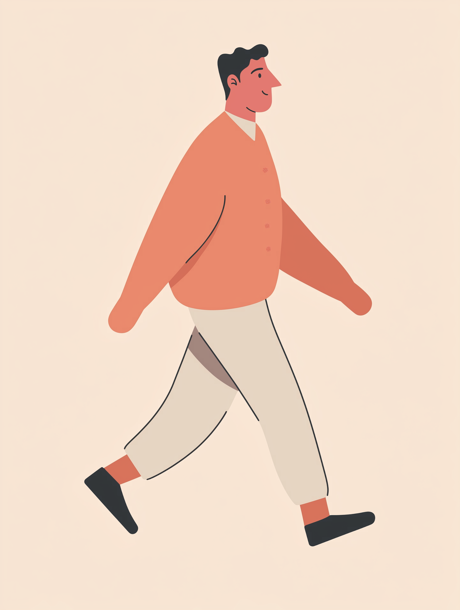 Minimalist illustration of a man walking in an orange sweater and beige pants, set against a light beige background.