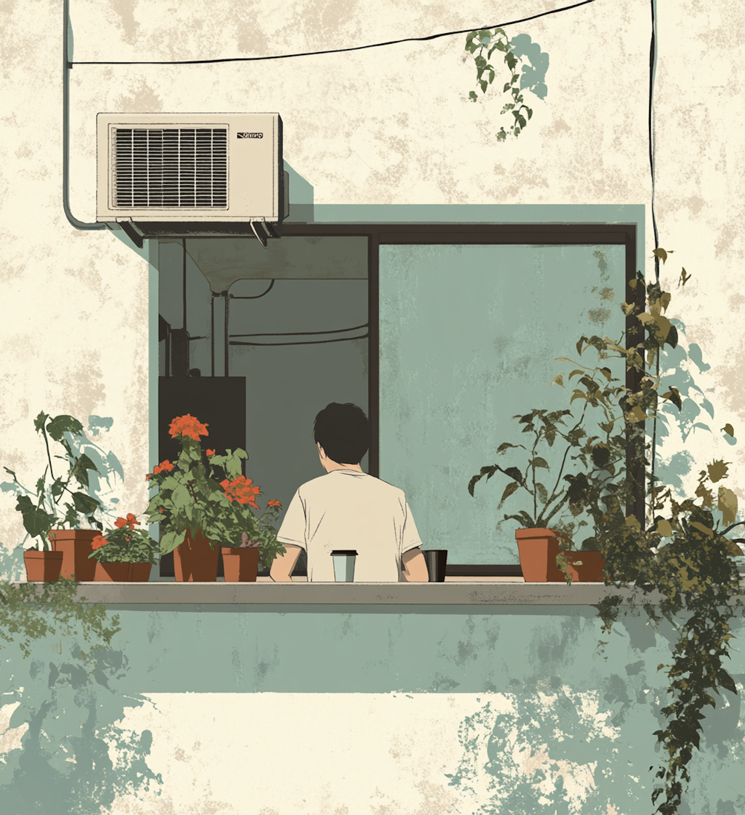 A person gazes out a window surrounded by potted plants and vines, creating a serene, nature-infused scene with muted colors.
