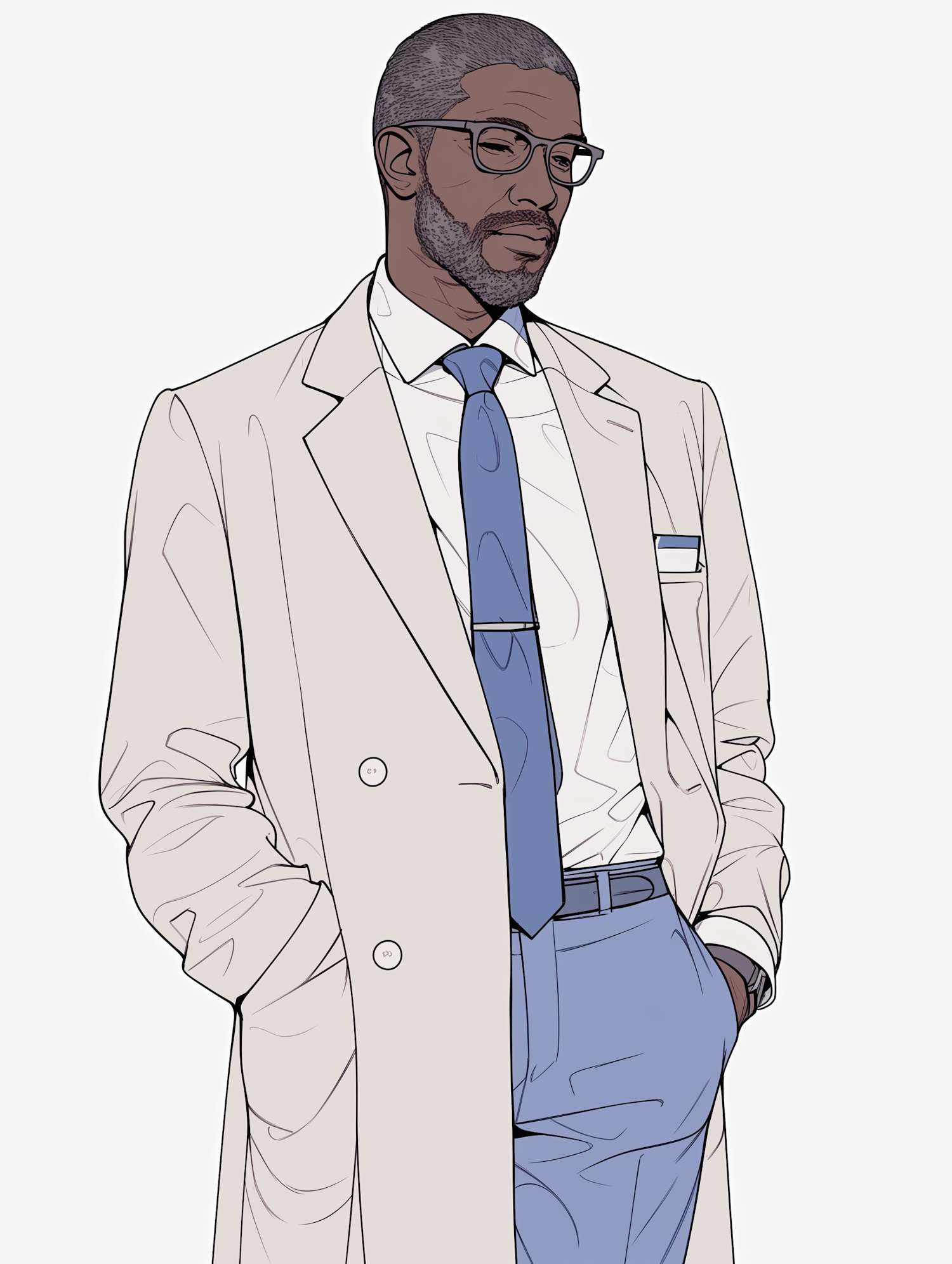 Illustration of a stylish man in a beige coat, blue tie, and glasses, exuding confidence and professionalism.