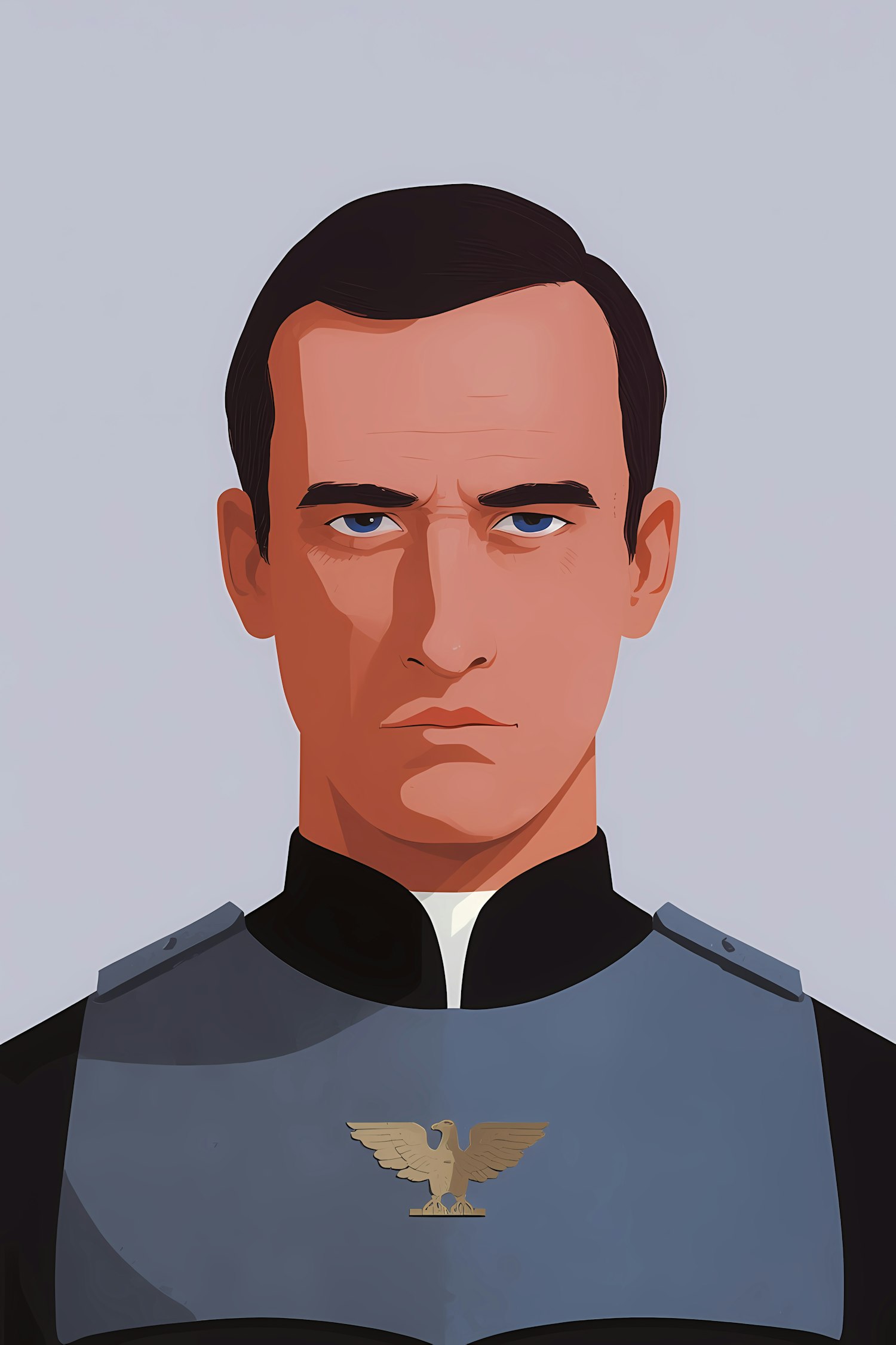 Stylized illustration of a man in a uniform with an eagle emblem, featuring a serious expression and a plain background.