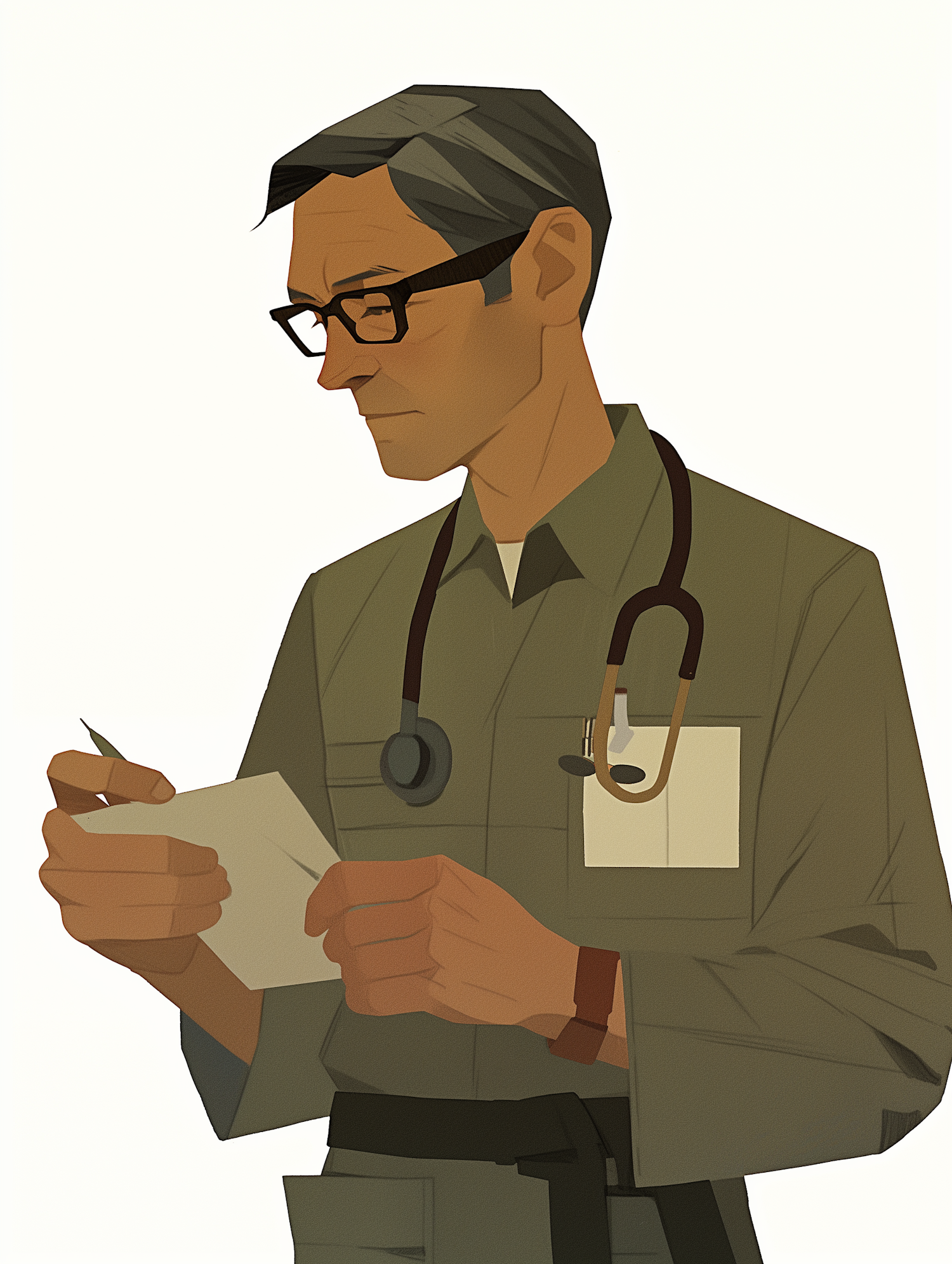 Stylized illustration of a middle-aged man in a green uniform with a stethoscope, writing on paper, conveying a medical professional.