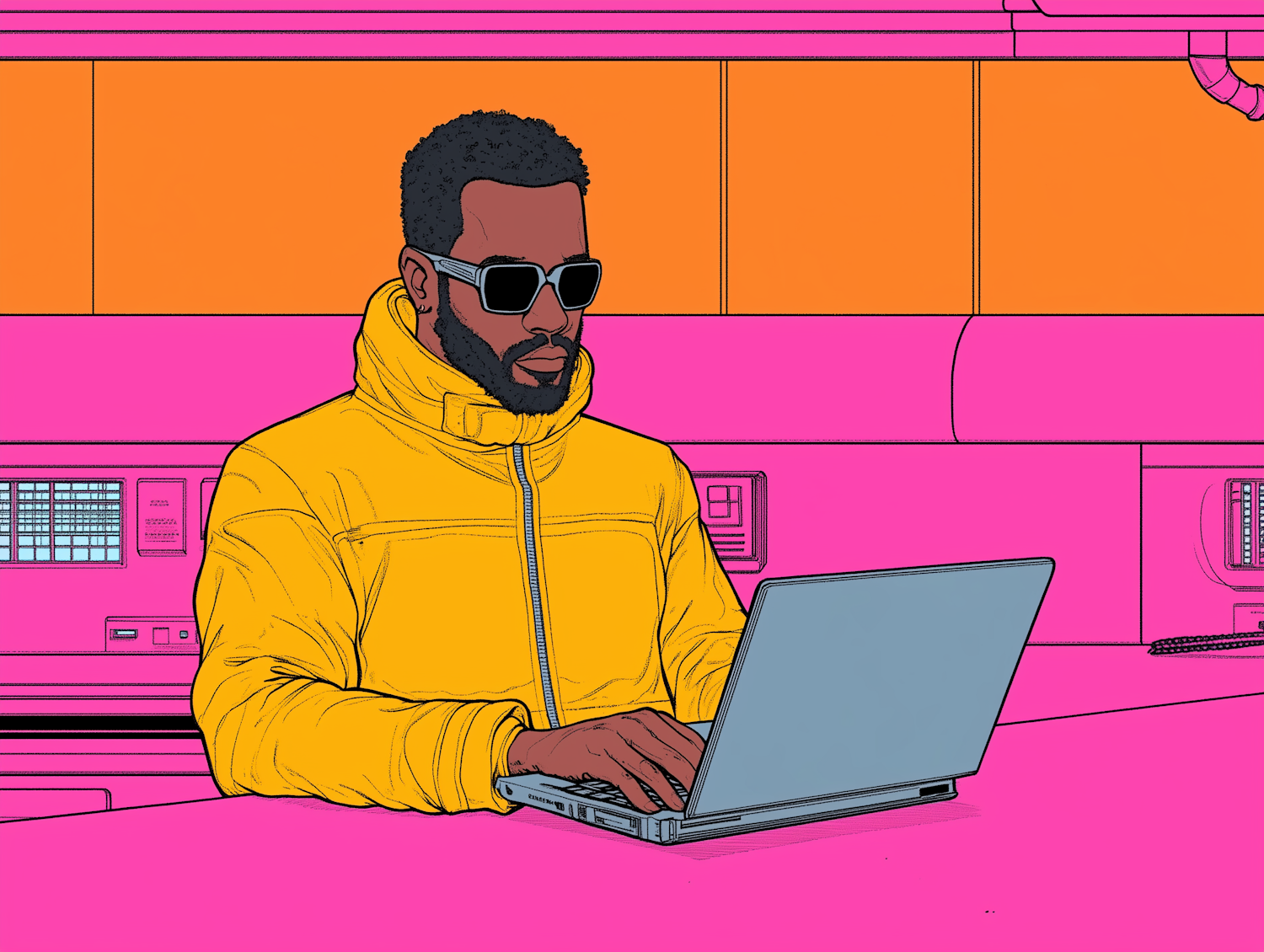 Stylish man in yellow jacket and sunglasses working on a laptop in a vibrant pink and orange futuristic setting.