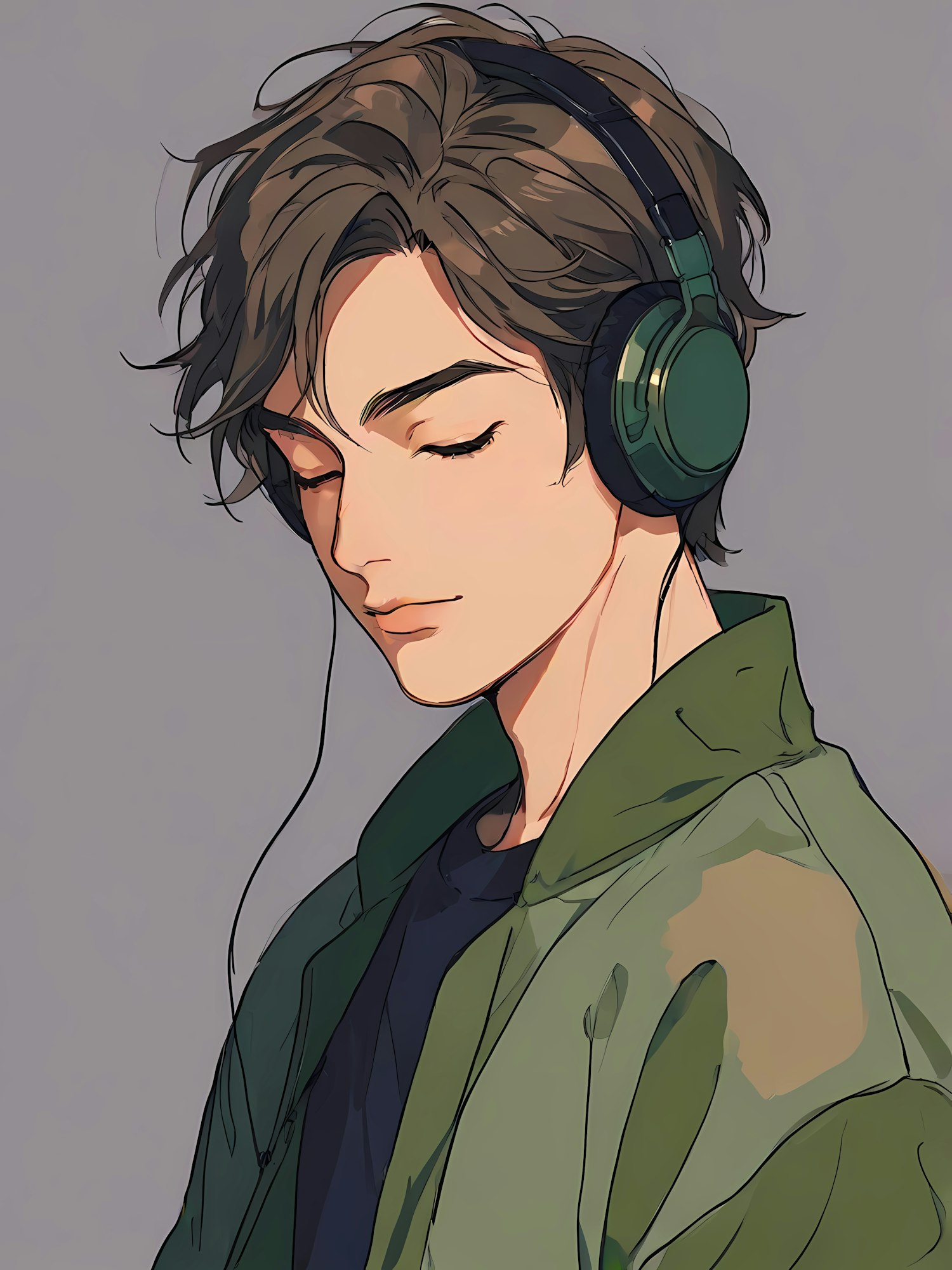 Stylized illustration of a serene young man with brown hair, green headphones, and a muted green jacket, enjoying music with eyes closed.