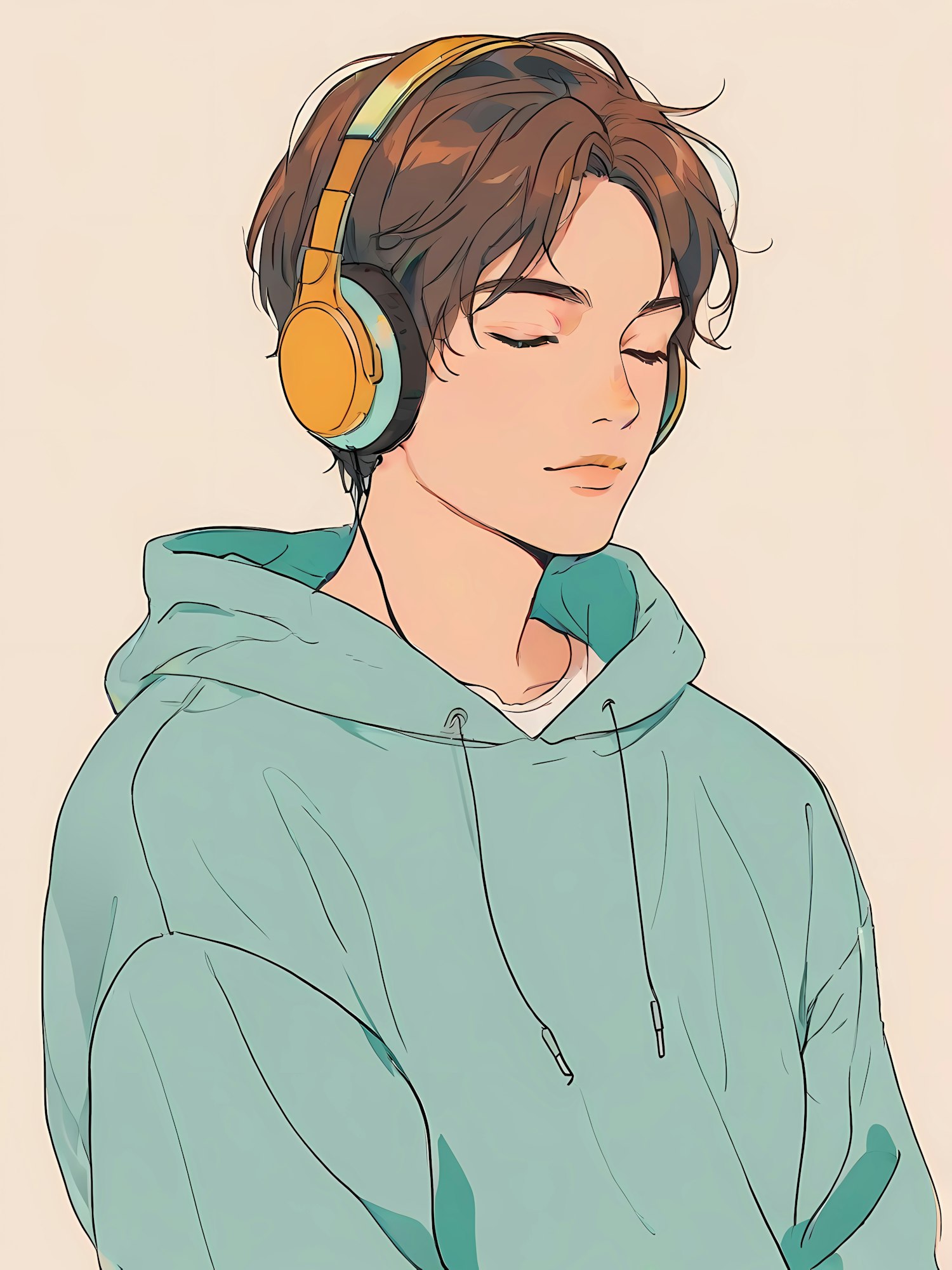 Stylized illustration of a young man in a teal hoodie, eyes closed, wearing yellow headphones, enjoying music. Minimalist and calming vibe.