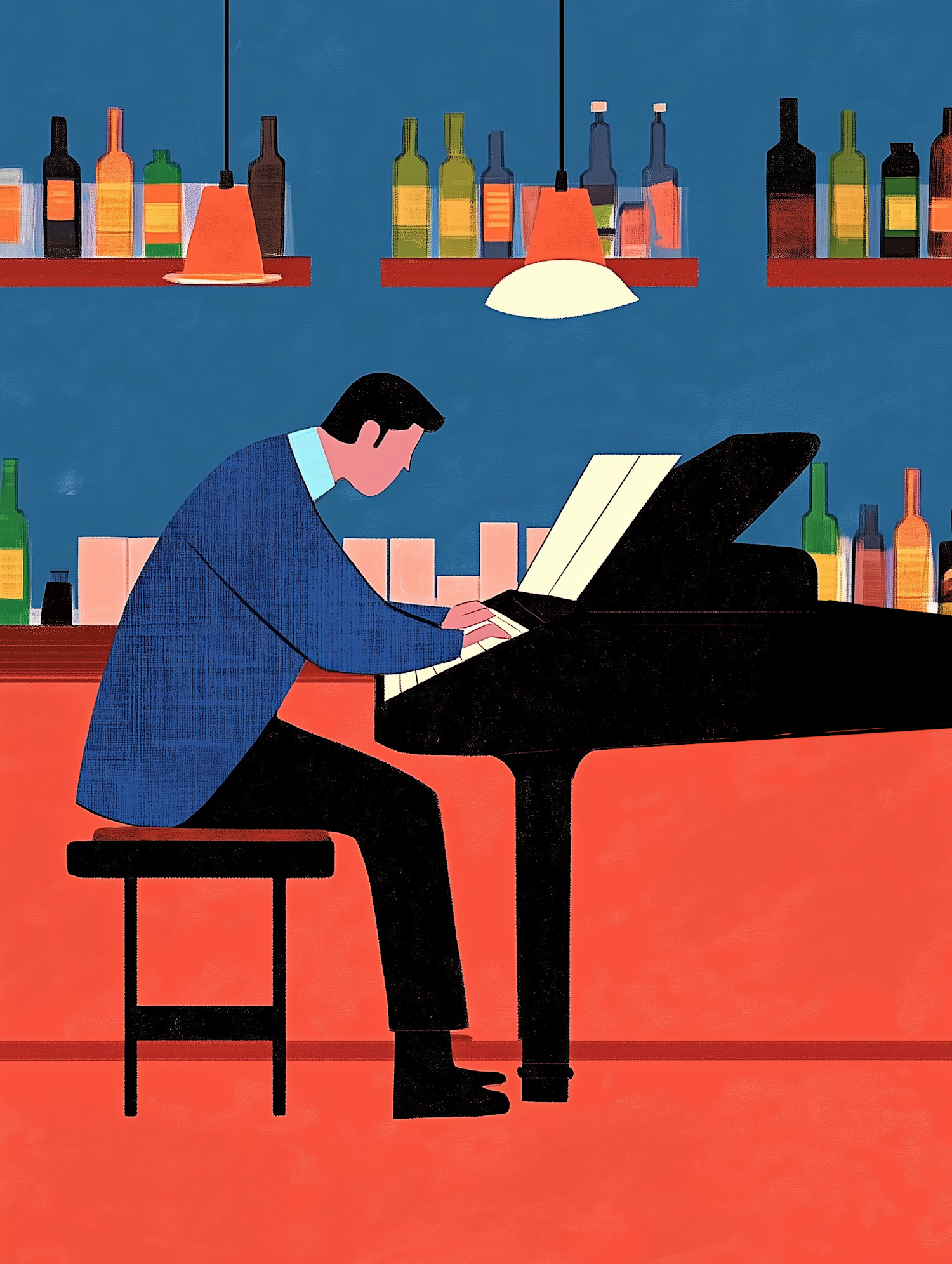 Illustration of a man playing piano in a bar, surrounded by bottles and warm lighting, creating a cozy ambiance.
