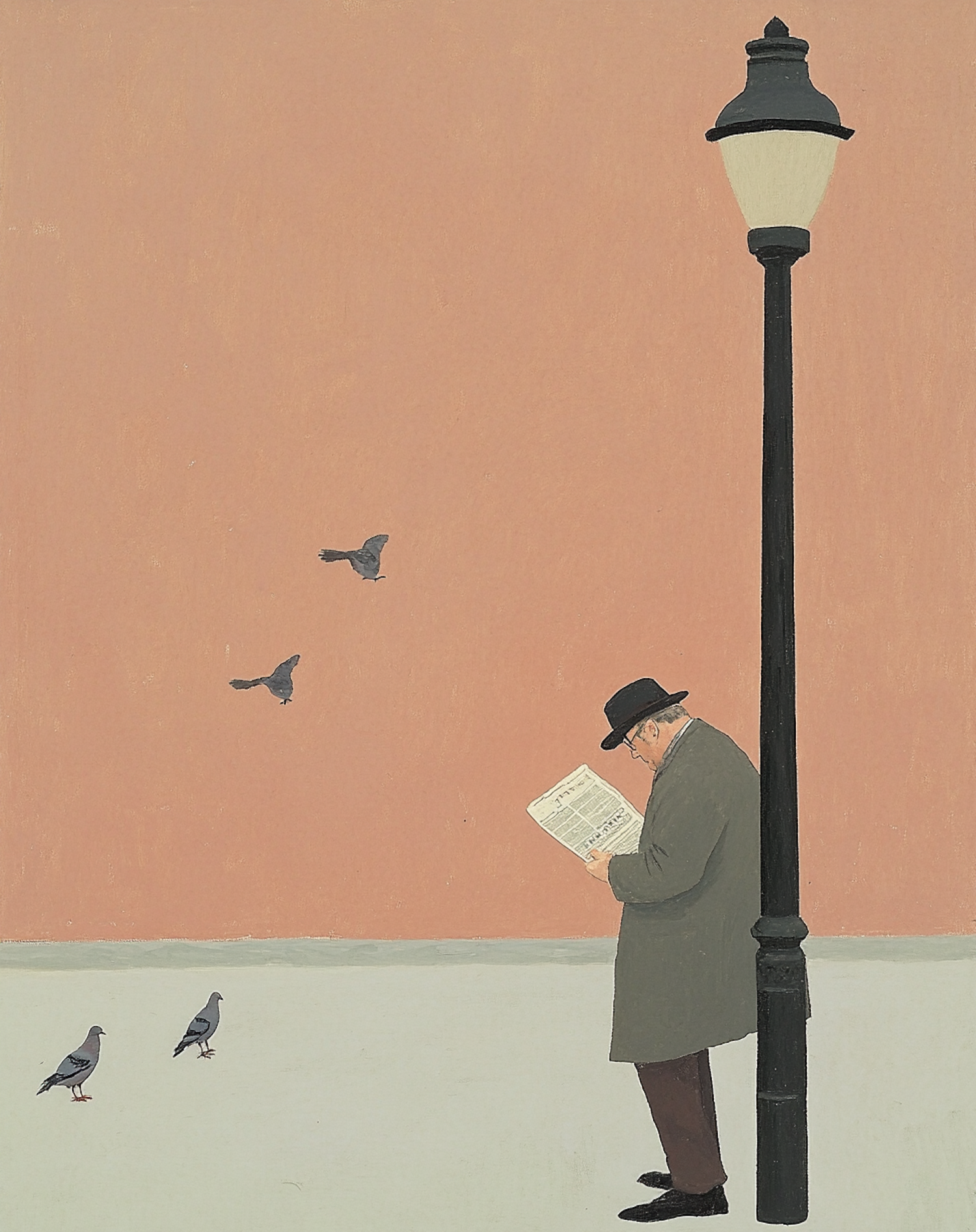 Minimalist illustration of a man reading a newspaper under a streetlamp, with pigeons nearby and a muted peach background.