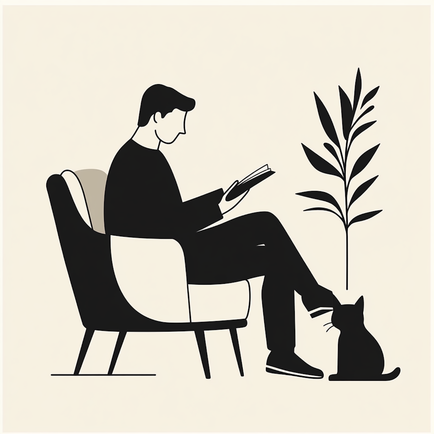 Minimalist illustration of a person reading in an armchair with a cat and a plant, in a black and white color scheme.