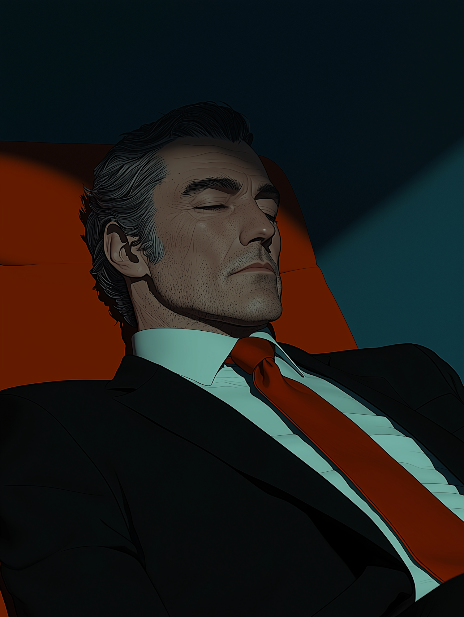 Stylized illustration of a man in a black suit and red tie reclining in an orange chair, with a calm expression and dramatic lighting.