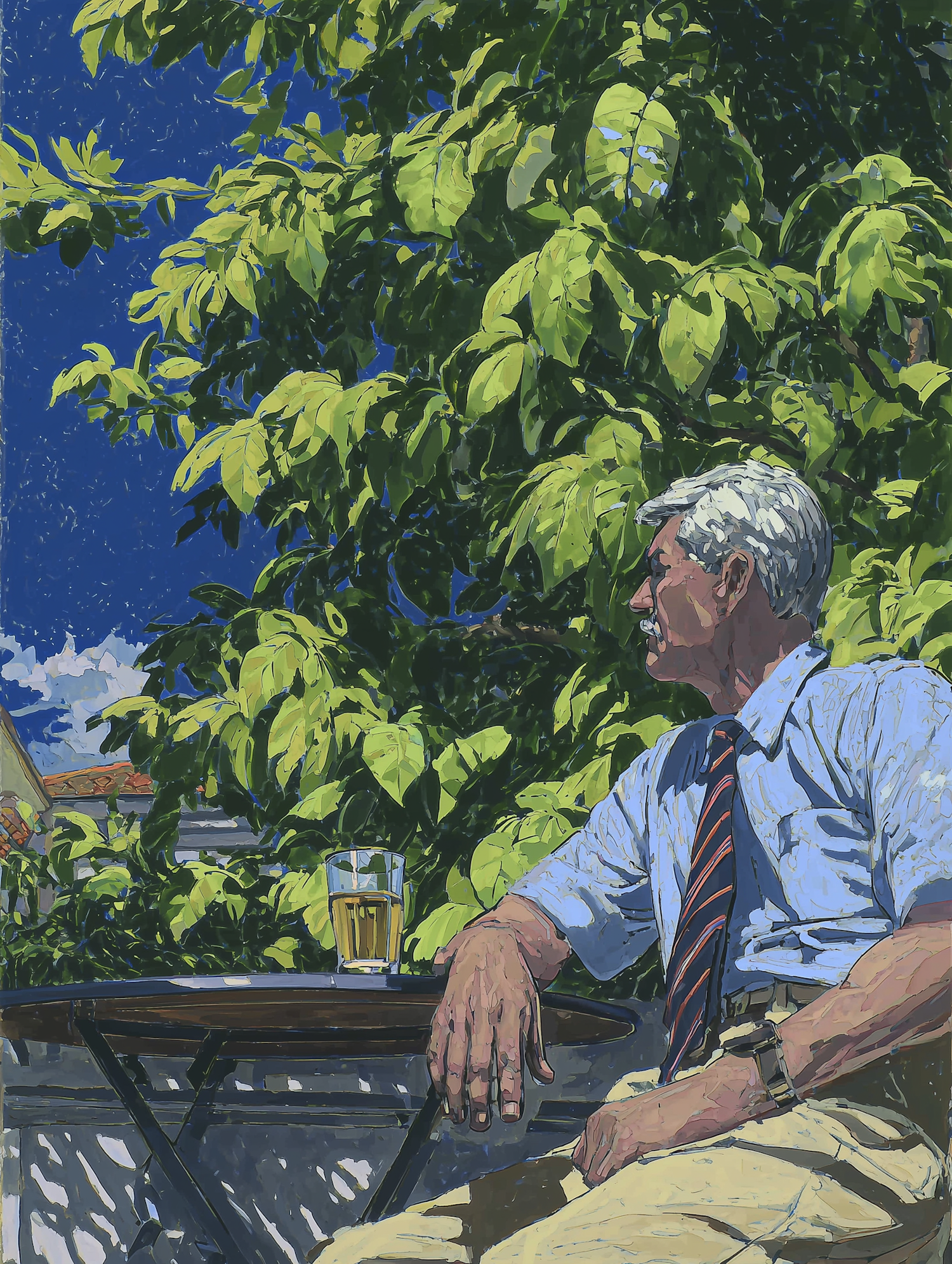 A man in a blue shirt and tie sits outdoors by a table with a drink, surrounded by lush greenery under a bright blue sky.