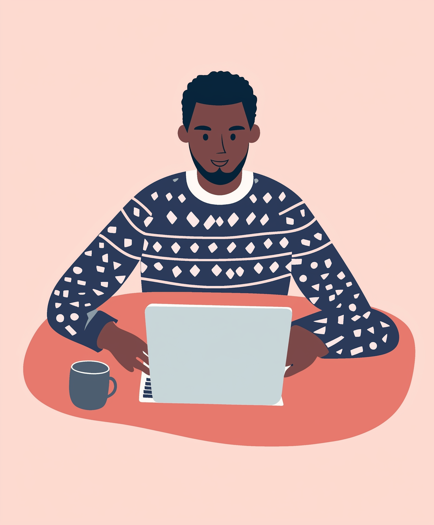 Illustration of a man with a laptop and coffee, wearing a patterned sweater, on a peach background. Modern and minimalist style.