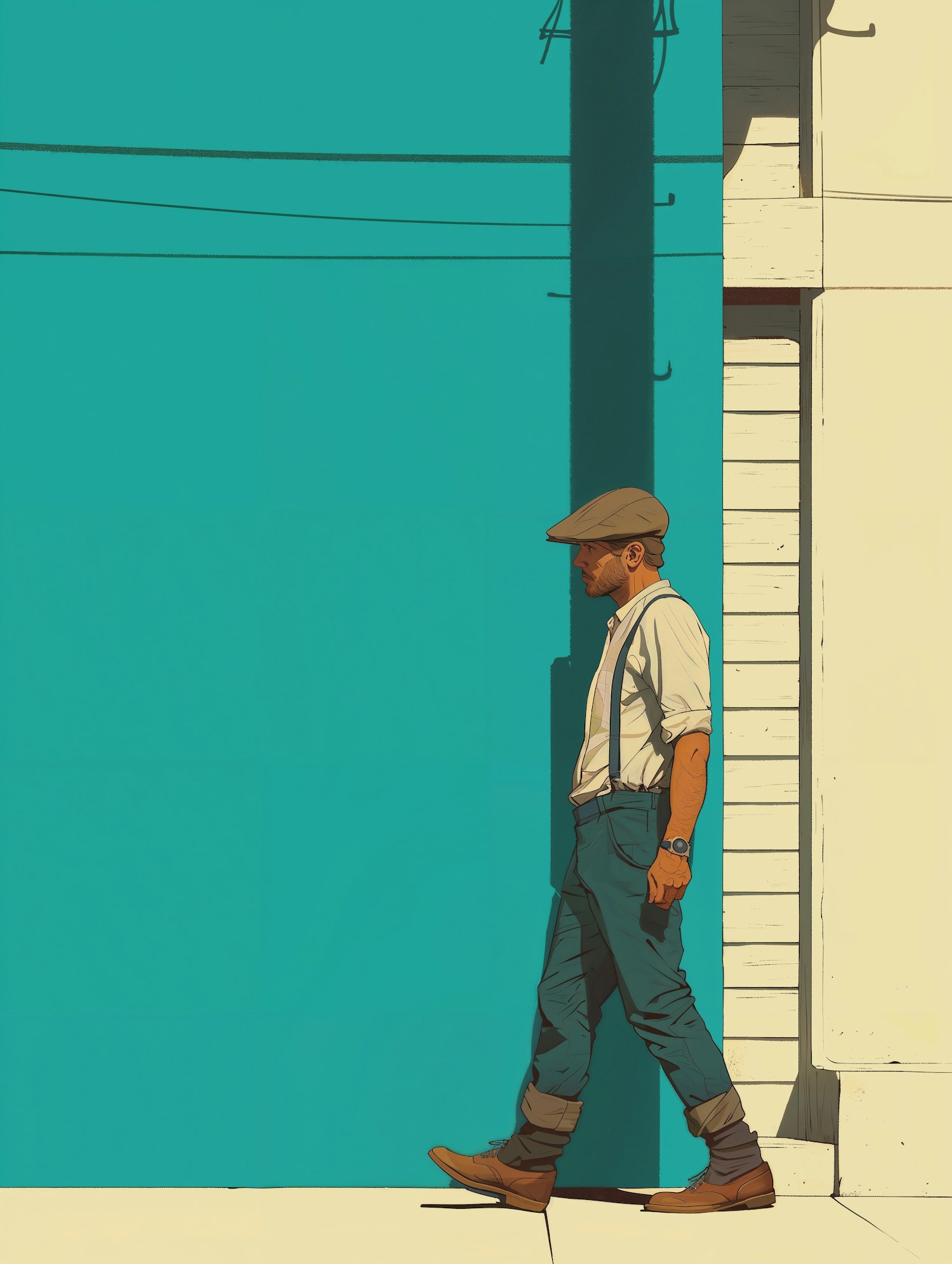 Stylish man in suspenders walks past a teal wall, casting a shadow. Flat cap, rolled-up sleeves, and brown boots add vintage charm.