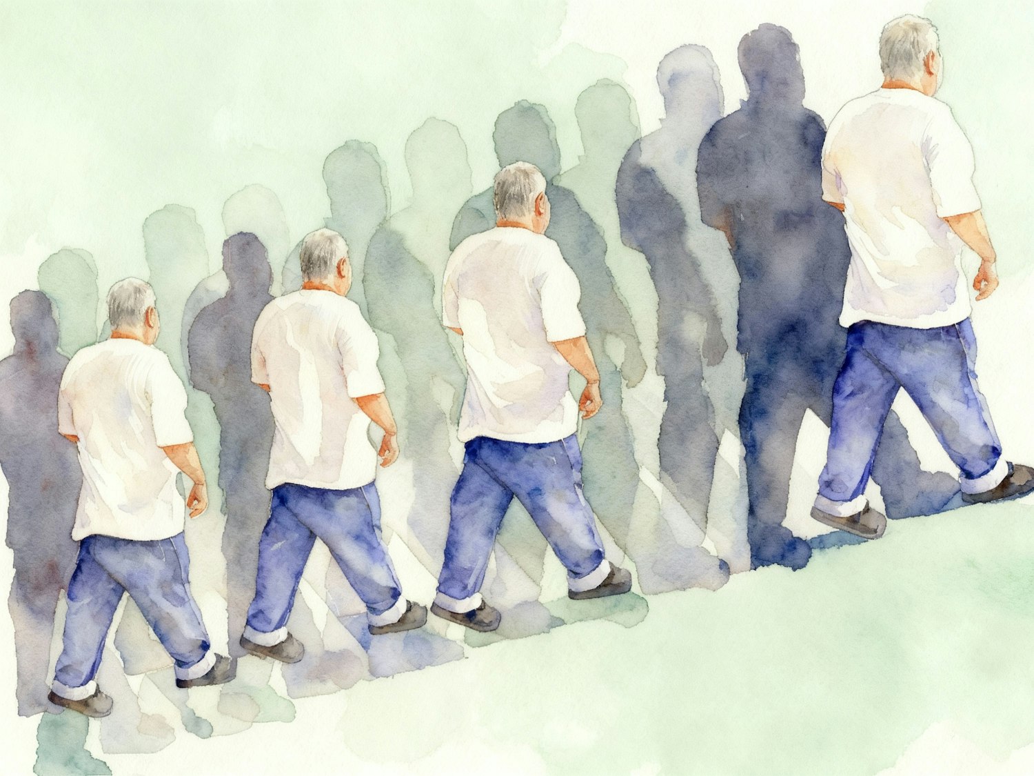 Watercolor illustration of a man walking, showing motion through overlapping figures and shadows, set against a soft green background.