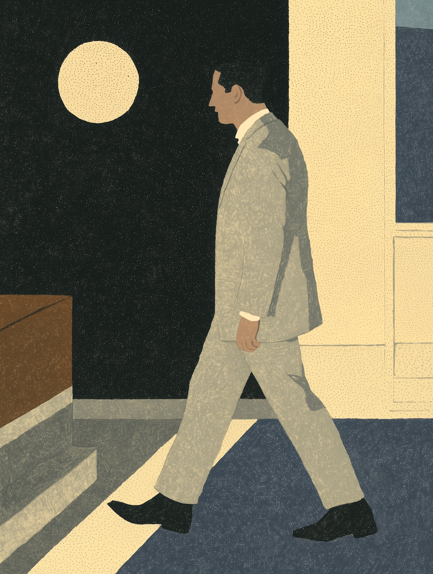 Illustration of a man in a gray suit walking, with a minimalist background featuring a black wall and white circle.