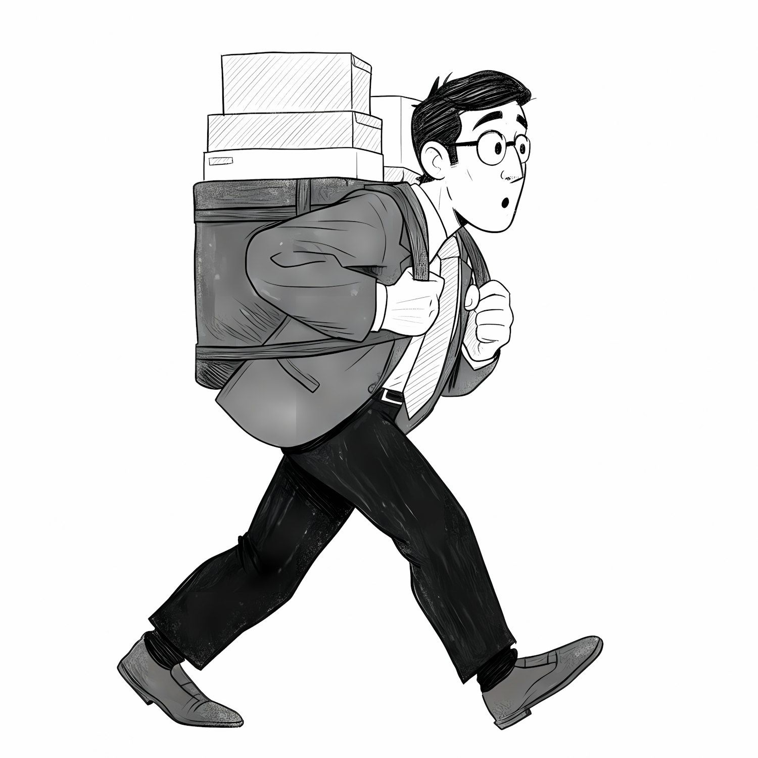 A black-and-white illustration of a man in a suit carrying a heavy backpack filled with boxes, walking briskly with a surprised expression.