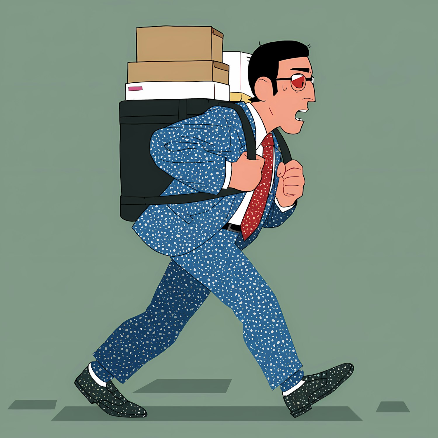 Cartoon of a man in a polka-dot suit carrying a heavy backpack with boxes, walking briskly against a green background.